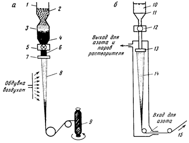 Рис.17. Схематическое изображение процессов сухого прядения (а) и прядения из расплава (б) 1 — загрузочная воронка; 2 — полимерные чешуйки; 3 — нагретая решетка; 4 — горячий полимер; 5 — дозирующий насос; б — расплав; 7— многоканальный мундштук, 8 — свежеспряденное волокно; 9 — катушка; 10 — раствор полимера; 11 — фильтр; 12 — дозирующий насос; 13 — многоканальный мундштук; 14 — свежеспряденное волокно; 15 — на катушку СУХОЕ ПРЯДЕНИЕ. Большое количество таких традиционных полимеров, как ПВХ или полиакрилонитрил, перерабатывают в волокна в крупных масштабах в процессе сухого прядения. Суть этого процесса показана на рис.17. Полимер растворяют в соответствующем растворителе с образованием высококонцентрированного раствора. Вязкость раствора регулируют увеличением температуры. Горячий вязкий раствор полимера продавливают через фильеры, получая, таким образом, тонкие непрерывные струйки. Волокно из этих струек образуется при простом испарении растворителя. Испарение растворителя может быть ускорено путем обдувания встречным потоком сухого азота. Волокна, образующиеся из раствора полимера, в конце концов наматывают на катушки. Скорость прядения волокон может достигать 1000 м/мин. Промышленные ацетатцеллюлозные волокна, полученные из 35%-ного раствора полимера в ацетоне при 40 °С, служат типичным примером получения волокон методом сухого прядения.МОКРОЕ ПРЯДЕНИЕ. При мокром прядении, как и при сухом, используют сильно концентрированные полимерные растворы, высокую вязкость которых удается понизить повышением температуры прядения. Детально процесс мокрого прядения показан на рис.18. В процессе мокрого прядения происходит переработка вязкого раствора полимера в тонкие струнки при пропускании через фильеры. Затем эти полимерные струйки попадают в коагуляционную ванну с осадителем, где и происходит высаживание полимера из раствора в виде тонких нитей, которые после промывки, сушки и пр. собирают на катушках. Иногда в процессе мокрого прядения вместо непрерывных нитей образуются комки, что происходит в результате обрыва вытекающей из фильеры струйки под действием сил поверхностного натяжения.