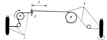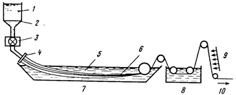 Рис.18. Схематическое изображение процесса мокрого прядения 1 — раствор полимера; 2 — фильтр; 3 — дозирующий насос; 4 — многоканальный мундштук; 5 — осадитель; 6 — свежеспряденное волокно; 7 — ванна для коагуляции и осаждения; 8 — ванна для промывки; 9 — сушка; 10 — на катушку Этого удается избежать при увеличении вязкости полимерного раствора. Коагуляция, которая является лимитирующей стадией мокрого прядения, процесс довольно медленный, чем и объясняется низкая, по сравнению с другими, скорость прядения раствора, равная 50 м/мин. В промышленности процесс мокрого прядения используют для получения волокон из полиакрилонитрила, целлюлозы, вискозного волокна и т.д. ОДНООСНАЯ ОРИЕНТАЦИЯ. В процессе прядения волокон из полимерного расплава или раствора макромолекулы в волокне не ориентированы и, следовательно, их степень кристалличности сравнительно низка, что нежелательным образом отражается на физических свойствах волокна. Для улучшения физических свойств волокна подвергают операции, называемой одноосной вытяжкой, используя растягивающие аппараты определенного типа.Основной особенностью аппарата является наличие системы двух роликов А и В (рис.19), вращающихся с различными скоростями. Ролик В вращается в 4-5 раз быстрее ролика А. Спряденную нить последовательно пропускают через ролик А, растягивающую шпильку 3 и ролик В. Поскольку ролик В вращается со скоростью большей, чем ролик А, волокно вытягивается под нагрузкой, задаваемой шпилькой 3. Вытяжка волокна осуществляется в зоне 2. После прохождения через ролик В вытянутая полимерная нить наматывается на металлическую бобину. Несмотря на то что в процессе вытяжки происходит уменьшение диаметра нити, ее прочностные свойства в значительной степени улучшаются вследствие ориентации макромолекул, параллельно оси волокна.