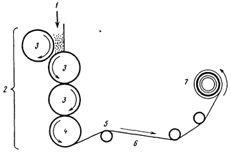 Рис. 1. Схема аппарата для каландрования / — полимерный компаунд; 2 — каландровочные валки: горячие (3) и холодный (4); 5 — каландрованный лист; б — направляющие валки; 7 — сматывающее устройство При использовании в каландровочной машине профилированных валков можно получать тисненые листы различных рисунков. Различные декоративные эффекты, такие, как имитация под мрамор, могут быть достигнуты путем введения в каландр смеси компаундов различных цветов. Технология обработки под мрамор обычно используется в производстве плиток для пола из поливинилхлорида. 2.4 ЛИТЬЕЛИТЬЕ В ФОРМЕ. Это сравнительно недорогой процесс, который состоит в переработке жидкого форполимера в твердые изделия требуемой формы. Этим методом могут быть получены листы, трубы, стержни и т.п. изделия ограниченной длины. Схематически процесс литья в форме представлен на рис.2. В этом случае форполимер, смешанный в соответствующих пропорциях с отвердителем и другими ингредиентами, выливают в чашку Петри, которая и служит формой. Затем чашку Петри помещают на несколько часов в печь, нагретую до необходимой температуры, до полного завершения реакции отвердения. После охлаждения до комнатной температуры твердый продукт вынимают из формы. Твердое тело, отлитое таким образом, будет иметь форму внутреннего рельефа чашки Петри.