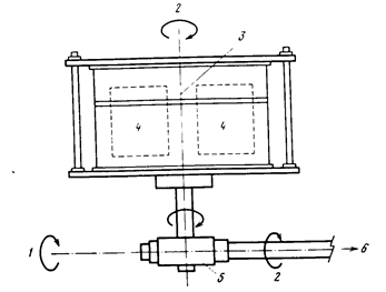 Рис.3. В процессе ротационного литья полые формы, наполненные полимерным материалом, одновременно вращают вокруг первичной и вторичной осей 1 — первичная ось; 2 — вторичная ось; 3 — деталь разъемной формы; 4 — полости формы; 5 — кожух зубчатой передачи; б—к мотору После достижения требуемой толщины стенок избыток пластизоля удаляется для проведения повторного цикла. Для окончательной гомогенизации смеси частиц поливинилхлорида с пластификатором гелеобразный продукт внутри формы нагревают. Конечный продукт вынимают из формы после его охлаждения струёй воды. Метод ротационного литья с использованием жидкого материала известен как метод "формования полых изделий заливкой и вращением формы". ЛИТЬЕ ПОД ДАВЛЕНИЕМ. Наиболее удобным процессом для производства изделий из термопластичных полимеров является процесс литья под давлением. Несмотря на то что стоимость оборудования в этом процессе достаточно высока, его несомненным достоинством является высокая производительность. В этом процессе дозированное количество расплавленного термопластичного полимера впрыскивается под давлением в сравнительно холодную пресс-форму, где и происходит его затвердевание в виде конечного продукта.Аппарат для литья под давлением изображен на рис.6. Процесс состоит из подачи компаундированного пластического материала в виде гранул, таблеток или порошка из бункера через определенные промежутки времени в нагретый горизонтальный цилиндр, где и происходит его размягчение. Гидравлический поршень обеспечивает давление, необходимое для того, чтобы протолкнуть расплавленный материал по цилиндру в форму, расположенную на его конце. При движении полимерной массы вдоль горячей зоны цилиндра устройство, называемое "торпедой", способствует однородному распределению пластического материала по внутренним стенкам горячего цилиндра, обеспечивая таким образом равномерное распределение тепла по всему объему. Затем расплавленный пластический материал впрыскивают через литьевое отверстие в гнездо пресс-формы. В простейшем виде пресс-форма представляет собой систему из двух частей: одна из частей движущаяся, другая — стационарная (см. рис.6). Стационарная часть пресс-формы фиксируется на конце цилиндра, а подвижная снимается и надевается на нее. При помощи специального механического устройства