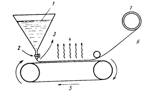расплавленного пластического материала под давлением 1500 кг/см ОТЛИВКА ПЛЕНОК. Метод отливки используют также и для производства полимерных пленок. В этом случае раствор полимера соответствующей концентрации постепенно выливают на движущийся с постоянной скоростью металлический пояс (рис.4), на поверхности которого и происходит образование непрерывного слоя полимерного раствора.