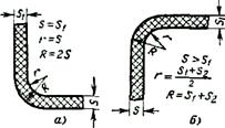 Рис. 1. Радиусы закругления Для изготовления тонкостенных изделий при литье термопластов необходимо применять термостатирование форм. Изготовление изделий из поликарбоната, полиформальдегида, его сополимера и полиамидов также требует термоста-тирования формы, а также предварительного подсушивания материала для улучшения свойств изделий. Переходы от большего сечения детали к меньшему выполняются при помощи радиусов закругления или уклонов. Торцы деталей для упрочнения выполняют в виде непрерывных буртиков по всему контуру детали. Толщина буртиков обычно не превышает 1,5—2 толщин стенки. Увеличение жесткости деталей достигается ребрами, которые не должны быть толще стенки, к которой они примыкают. Толщина ребер составляет 0,6— 0,8 толщины стенки. Ребра жесткости не должны доходить до опорной поверхности детали или до края примыкающего к нему элемента детали на 0,5—1,0 мм. Сечение ребра жесткости должно быть постоянным по всей длине и иметь небольшой технологический уклон. Углы и грани изделия должны быть скруглены, форма изделия возможно более обтекаемой. Радиусы закруглений на изделиях из пластмасс показаны на рис.1. Острые кромки на детали, необходимые по конструктивным требованиям, скругляются минимальным радиусом округления 0,5 мм. Радиусы закругления и фаски для- деталей из пластмасс и металла регламентированы ГОСТ 10948-64. На одном изделии рекомендуется применять наименьшее число размеров радиусов закругления.