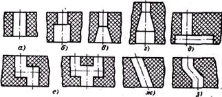 Рис. 3. Конфигурация сквозных отверстии. а — цилиндрическое; б — ступенчатое, состоящее из двух цилиндрических отверстий разного диаметра; б — ступенчатое: цилиндрическое переходит в коническое; г — ступенчатое, имеющее цилин-дрическо-конические уступы; д, е — отверстия с пересекающимися осями; лс — отверстие с наклонной осью; з — отверстие со смещенными и наклонной к вертикали осями. Для устранения коробления, усадки и неровностей больших площадей, повышения жесткости и точности сопрягаемых элементов деталей применяют выступающие над поверхностями опорные плоскости в виде выступов, бобышек, буртиков. При конструировании опорных поверхностей их размеры необходимо ограничивать до минимума. Сплошные опорные поверхности заменяют опорами на три точки. Накатку и рифление выполняют прямыми ребрами, параллельными направлению выталкивания детали из формы. На конических и цилиндрических поверхностях не допускаются винтовые или сетчатые рифления.