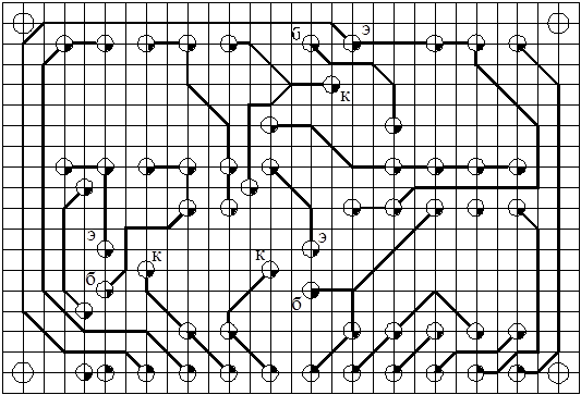 Таким образом, на печатную плату размером 70´47.5 можно установить 36 элементов. 5. ТЕХНОЛОГИЯ ИЗГОТОВЛЕНИЯ ОДНОСТОРОННЕЙ ПЕЧАТНОЙ ПЛАТЫ Технологический процесс изготовления печатной платы (ПП) химическим методом был выбран исходя из достоинств и недостатков метода. ПП изготавливается химическим методом, следовательно рисунок ПП должен быть выполнен сеточно-графическим методом. Данный метод широко используется при массовом производстве ПП из одностороннего фольгированного диэлектрика, чаще гетинакса. Сущность метода заключается в том, что нанесение рисунка на заготовку платы осуществляется сквозь сетку – трафарет, по которому перемещается ракель и продавливает краску на плату. Затем плата с печатным рисунком подвергается травлению. К достоинствам метода относятся высокая механизация и автоматизация технологического процесса, быстрота налаживания оборудования, малое число обслуживающего персонала. Недостатки: отсутствие металлизации отверстий, изоляционное основание подвергается воздействию химических веществ. Технология изготовления ПП сеточно-химическим методом состоит из следующих основных операций: 1. Раскройка материала и изготовление заготовок плат на дисковых ножницах; 2. Нанесение рисунка схемы кислотостойкой краской; 3. Травление схемы; 4. Удаление защитного слоя краски; 5. Крацовка; 6. Нанесение защитной эпоксидной маски; 7. Горячее лужение мест пайки; 8. Штамповка; 9. Маркировка; 10.Подготовка платы; 11.Подготовка выводов навесных элементов; 12.Установка элементов на плату; 13.Пайка элементов на плате; 14.Технический контроль; 15.Регулировка; 16.Технический контроль. Рассмотрим подробней некоторые из этих основных операций. 1. Раскройка материала и изготовление заготовок плат.