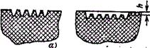 Рис. 5. Конструкции рифлении а—ребра рифления заподлицо с плоскостью изделия; 6 — ребра рифления ниже плоскости изделия. Ширина ребер рифления должна быть не менее 0,3—0,5 мм, а высота возвышения над базовой поверхностью не должна превышать их ширины. При рифлении цилиндрической поверхности или поверхности, имеющей съемный уклон, ребра рифления должны иметь съемные уклоны, превышающие уклон базовой поверхности. Наиболее целесообразно применять па цилиндрических и конических наружных поверхностях глухие ребра рифления (рис. 4). Для плоских Поверхностей применяют прямое (параллельное) и сетчатое рифление полукруглого или треугольного сечения. При сетчатом рифлении взаимное пересечение ребер должно быть в пределах 60—90°. Рифление плоских наружных поверхностей целесообразно выполнять так, чтобы ребра рифления были заподлицо с плоскостью изделия или несколько ниже (рис. 5). . Резьбы в пластмассовых изделиях получают тремя основными способами: 1) непосредственно при прессовании или литье изделия; 2) механической обработкой отдельных элементов изделия; 3) вставкой металлических частей, имеющих резьбы. На деталях из пластмасс можно получать наружную, и внутреннюю резьбу различного профиля. Можно применять резьбу метрическую, дюймовую, трубную, цилиндрическую по ГОСТ 6357-52, коническую дюймовую по ГОСТ 6111-52 и др. Метрическая резьба на деталях диаметром 1—20 мм регламентирована ГОСТ 11709-66. Диаметры и шаги резьбы выбирают по ГОСТ 8724-58; не рекомендуется применять шаги 0,5, 0,75, 1,0 мм для диаметров резьбы соответственно свыше 16, 18, 36 мм. Основные резьбы с крупным и мелким шагом выбирают по ГОСТ 9150-59. Шаг резьбы выбирают в соответствии с приложением к ГОСТ 11709-66. Для термореактивиых материалов с порошкообразным наполнителем наиболее прочной является резьба с шагом 1,5 мм. Резьбы с более крупными или меньшими шагами имеют меньшую прочность. На термопластичных материалах можно получить резьбу с любым шагом. Наиболее экономичными и производительными способами получения резьбы являются компрессионное и литьевое прессование и литье под давлением. Резьбы могут быть получены с точностью классов 2а, 3 и 4. Процесс получения наружных резьб технологически проще процесса получения внутренних резьб, так как первые могут быть оформлены разъемными матрицами, а внутренние резьбы требуют свинчивания детали. Если прочность резьбы должна быть высокой или деталь .необходимо часто отвинчивать, резьбу следует нарезать на металлических вставках, заделанных при формовании. Резьбы легче нарезать на деталях из термореактивных пластиков с волокнистыми наполнителями, чем на деталях из порошкообразных материалов. Для соединений, требующих точности, следует применять метрическую резьбу по ГОСТ 11709-66. При расчете диаметра резьбы необходимо учитывать усадку материала и оставлять зазор между винтом и гайкой больше, чем для изделий из металла. При длине резьбы более 20—25 мм усадку рассчитывают и для шага резьбы. Для более грубых резьбовых соединений применяют резьбу круглого профиля. Шаг резьбы 2,5—4 мм. Для всех видов прессуемых резьб обязательно наличие фаски или кольцевой выточки на конце резьбы. Величина фаски регламентирована ГОСТ 10549-63. Для наружной резьбы наличие фаски на заходной части нежелательно: затрудняет изготовление формующего элемента. В тонкостенных