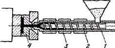 Рис. 6. Схема получения изделия на литьевой машине со шнековой пластикацией. При изготовлении деталей с толщиной стенки до 10 мм и деталей с массой, в 2—3 раза превышающей номинальный объем отливки, на который рассчитана машина, применяется метод интрузии, т. е. заполнение формы производится вращающимся шнеком и последующим поджатием материала в течение времени выдержки под давлением. Сущность метода инжекционного прессования заключается в том, что заполнение формы производится с помощью шнека, а перемещение механизма запирания используется для компенсации усадки материала и для придания ему необходимой конфигурации. Этим способом получают детали толщиной более 20 мм. В современном машиностроении наибольшее распространение получили одноцилиндровые конструкции литьевых машин горизонтального типа с пластикацией материала шнеком. Для литья изделии с арматурой применяют вертикальные литьевые машины. Большое распространение приобретает многопозиционное литьевое оборудование: револьверное и роторное. Револьверные машины имеют одну позицию подачи материала и несколько позиций смыкания форм, расположенных на подвижном столе. Многопозиционное литьевое оборудование позволяет повысить производительность более чем в 4 раза по сравнению с однопозиционным. Литьевое оборудование применяется для изготовления одно-, двух- и трехцветных деталей и деталей с арматурой, фитингов для сваривания крупногабаритных деталей и т. д. Литьевое оборудование в настоящее время создается универсальным по параметрам и специализированным по перерабатываемым материалам. Специализация машин по перерабатываемым материалам достигается комплектацией их рабочими органами, отвечающими свойсгвам полимерных материалов и особенностям процесса литья. Специальные требования указываются в заказе на машину. Современные литьевые машины перерабатывают полиамиды, полиформальдегид, поликарбонат, непластифицированный поливинилхлорид, пол и акр платы, наполненные материалы, полипропилсн, полистирол и его сополимеры и другие термопласты, а также термореактивные материалы. При переработке материалов повышенной гигроскопичностью (полиамиды) необходимо тщательно высушивать их перед литьем в сушильных шкафах при соответствующих режимах. При переработке таких материалов целесообразно использовать специальные бункерные сушилки. Подогрев материала желательно производить под вакуумом. При переработке порошкообразных материалов, склонных к зависанию (поливинилхлорид непластифицированный, а также реактопласты), применяются специальные бункера, улучшающие загрузку и транспортировку материала без образования сводов и-зависании. При переработке полиамида, поликарбоната, полиформальдегида формование изделии производится в формах, нагретых до 80—140°С с помощью термостатов. Примерные режимы литья под давлением некоторых терлюпластов