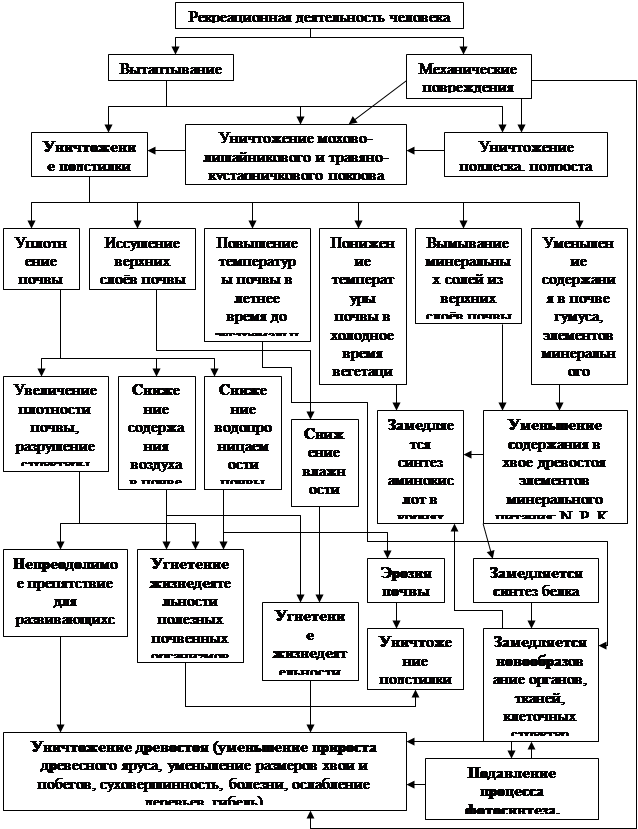 Одно из тревожных явлений последних лет – усыхание лесов: новый вид разрушения. Ведущий к нарушению всех внутриэкосистемных связей и к гибели лесной экосистемы. Начало заболевания леса, как правило, связывают с угнетающими действиями промышленного загрязнения окружающей среды: кислотные дожди, токсические вещества, содержащиеся в воздухе, а так же влиянием климатических факторов или даже микро волн, электрическими токами высокого напряжения и радиоактивностью. На ослабленных деревьях значительно увеличивается количество насекомых-паразитов, болезнь усиливается, больных деревьев становится больше. Возрастает опасность лесных пожаров, учащаются ветровалы в лесу, ухудшается качество древесины. Экосистема начинает деградировать и в конце концов погибает. Большие масштабы и высокие темпы нарушения лесов, разнообразие обуславливающих их причин затрудняет проведение конкретных лесоохранных мероприятий. К постоянным причинам деградации лесов относятся и повреждения дикими животными, выпас скота, особенно крупнорогатого[4]. С давних времён лес всегда привлекал к себе большое количество охотников, сборщиков ягод и грибов и просто желающих отдохнуть. С развитием в нашей стране массового туризма количество посетителей леса, настолько возросло, что превратилось в фактор, который нельзя учитывать при охране леса. Миллионы людей в летнее время, особенно в субботние и воскресные дни, выезжают в пригородные леса, чтобы провести свои выходные дни или отпуск на лоне природы. Тысячи туристов совершают походы по одним и тем же маршрутам. В пригородных лесах нередко можно встретить целые палаточные городки с многочисленным населением. Посетители леса вносят крупные изменения в его жизнь. Для установки палаток рубят подрост, снимают, ломают и губят молодую поросль. Молодые деревья гибнут не только под кострищами, но и под топорами, а то и просто под ногами многочисленных посетителей. Леса, часто посещаемые туристами, настолько основательно захламляются консервными банками, бутылками, тряпками, бумагой и т. д., несут следы больших и малых ран, что это отрицательно сказывается на естественном лесовозобнавлении. Несут и везут букеты цветов, ветки зелени, деревьев, кустарников. Спрашивается, что же будет, если каждый из приходящих в лес сорвёт только по одной ветке, одному цветку? И не случайно после ряда лет браконьерского отношения к природе в наших, особенно пригородных, лесах не стало многих когда-то в изобилии растущих растений, кустарников и деревьев. Весной десятки тысяч горожан устремляются в леса за черёмухой, сиренью. Не удовлетворяются скромными букетами. Охапки, веники, зачастую на крышах автомобилей. Как тут не позавидовать тонкому вкусу японцев, которые считают, что букет испорчен, если в нём долее трёх цветков. Не последние место в нанесение ущерба занимает обычай украшения новогодних ёлок. Если принять, что одна праздничная ёлка приходится на 10-15 жителей, то становится ясно каждому, что, к примеру, большому городу эта уютная традиция обходится ежегодно в несколько десятков, а то и сотен тысяч молодых деревьев. Особенно страдают малолесные районы. Присутствие даже одного человека не проходит для леса бесследно. Сбор грибов, цветов и ягод подрывает самовозобновление ряда видов растений. Костёр на 5-7 лет полностью вывод
