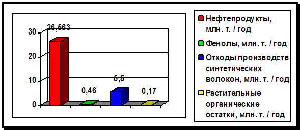 Среди вносимых в океан с суши растворимых веществ, большое значение для обитателей водной среды имеют не только минеральные, биогенные элементы, но и органические остатки.Вынос в океан органического вещества оценивается в 300 - 380 млн.т./год.Сточные воды, содержащие суспензии органического происхождения или растворенное органическое вещество, пагубно влияют на состояние водоемов.Осаждаясь, суспензии заливают дно и задерживают развитие или полностью прекращают жизнедеят данных микроорганизмов, участвующих в процессе самоочищения вод. При гниении данных осадков могут образовываться вредные соединения и отравляющие вещества, такие как сероводород, которые приводят к загрязнению всей воды в реке. Наличие суспензий затрудняют также проникновение света в глубь воды и замедляет процессы фотосинтеза. Одним из основных санитарных требований, предъявляемых к качеству воды, является содержание в ней необходимого количества кислорода. Вредное действие оказывают все загрязнения, которые так или иначе содействуют снижению содержания кислорода в воде .Поверхностно активные вещества - жиры, масла, смазочные материалы- образуют на поверхности воды пленку, которая препятствует газообмену между водой и атмосферой, что снижает степень насыщенности воды кислородом. Значительный объем органических веществ, большинство из которых не свойственно природным водам, сбрасывается в реки вместе с промышленными и бытовыми стоками. Нарастающее загрязнение водоемов и водостоков наблюдается во всех промышленных странах. Информация о содержании некоторых органических веществ в промышленных сточных водах предоставлена на рисунке 1.