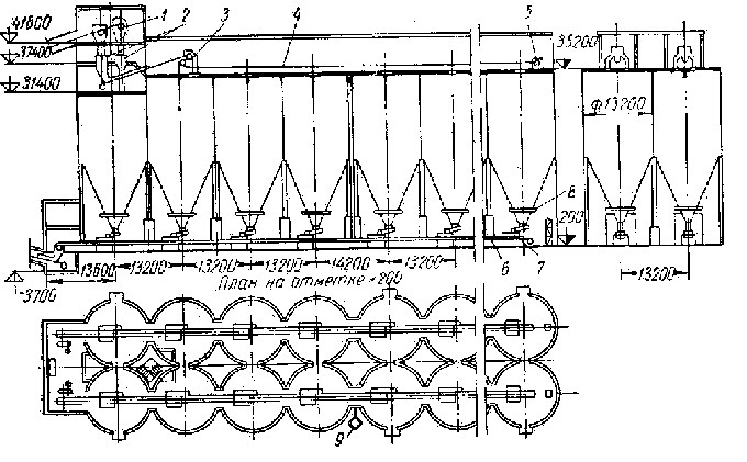Рисунок 2 – Схема роторного вагоноопракидывателя 3 ЗАКРЫТЫЕ СКЛАДЫ Закрытые склады представляют собой ряд железобетонных бункеров, над которыми устанавливается распределительный ленточный транспортер, снабженный передвижной разгрузочной тележкой. Уголь из бункеров выпускают на сборный транспортер с помощью питателей или передвижных дозировочных столов. Склады закрытого типа могут быть в виде одного или не скольких рядов прямоугольных или круглых бункеров, а также в виде длинных хранилищ с перегородками для углей различных шахтогрупп. Компактность и полная механизация подачи угля на склад и выдачи его на производство — таковы главные преимущества складов закрытого типа, благодаря которым появляется возможность при определенных условиях (при большом количестве бункеров) производить 100%-ное усреднение углей. Кроме того, появляется возможность совмещения процесса хранения и дозирования углей, т. е. использование, склада закрытого типа как дозировочного отделения. Склад состоит из типовых секций по восемь бункеров. Поэтому при привязке типового проекта к определенному заводу количество бункеров следует брать кратным восьми. Диаметр бункера 13 м, высота 35 м, емкость 2500 т. Сооружаются бункера из монолитного железобетона в передвижной опалубке. Выпускные воронки бункеров металлические. Для предотвращения зависания угля в воронках имеется пневмообрушивающее устройство.