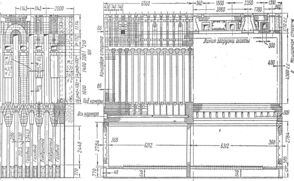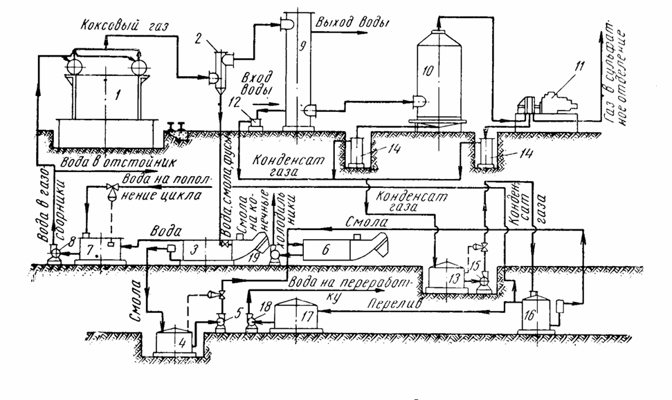 Рисунок 5 – Схема коксовой печи 6 УЛАВЛИВАНИЕ Огромное значение имеет оптимальный температурный режим охлаждения газа в первичных холодильниках для последующих процессов, улавливания аммиака, бензольных углеводородов и других химических продуктов коксования. В зависимости от типа Применяемых холодильников — трубчатых с теплопередачей через стенку или непосредственного действия — различают две отличные друг от друга схемы первичного охлаждения газа. Обе эти схемы нашли широкое применение в практике отечественной коксохимической промышленности. В последние годы в качестве типовой принимается схема первичного охлаждения коксового газа в трубчатых холодильниках, как более экономичная. На рис. представлена технологическая схема первичного охлаждения коксового газа с применением трубчатых холодильников. По этой схеме коксовый газ, надсмольная вода, смола и Фусы из газосборников 1 отводятся по газопроводу в сепаратор 2, где коксовый газ отделяется от жидкой фазы. Для обеспечения необходимой скорости стекания жидкой фазы газопровод от газосборников до сепаратора укладывается с уклоном 10— 15 мм на каждый погонный метр. Смесь надсмольной воды, смолы и фусов из сепаратора 2 поступает в механизированный отстойник-осветлитель 3, где из-за резкого уменьшения скорости жидкой фазы она расслаивается вследствие разности плотностей. Фусы, имеющие наибольшую плотность, оседают на дно осветлителя, откуда они непрерывно удаляются скребковым транспортером. Смола, занимающая в осветлителе промежуточное положение, самотеком через регулятор уровня смолы (смолоотводчик) поступает в заглубленный промежуточный сборник 4, откуда насосом 5 откачивается в механизированное хранилище для смолы 6. Установка механизированных хранилищ емкостью 650 м3 обусловлена тем, что в смоле после осветлителя все еще содержится значительное количество фусов. Последние, оседая на дно хранилищ, удаляются также при помощи скребковых транспортеров. Отстоявшаяся от смолы и фусов надсмольная вода из верхней части осветлителя поступает в промежуточный сборник 7, из которого насосом 8 подается в газосборники на орошение горя чего газа. Таким образом, надсмольная вода, подаваемая на орошение газооборников, находится в замкнутом цикле: газосборники -> осветлитель -> промежуточный сборник -> газосборники. Коксовый газ из сепаратора 2 поступает в межтрубное пространство газовых холодильников 9 и охлаждается холодной технической водой, поступающей в трубное пространство холодильников. При температуре входящей охлаждающей воды 20— 25° С коксовый газ охлаждается до 25—30° С. В связи с большим объемом газа на современных коксохимических заводах устанавливают несколько холодильников, включаемых параллельно или последовательно. Из холодильников 9 коксовый газ поступает в электрофильтры 10. Охлажденный и очищенный от туманообразной смолы газ засасывается в нагнетатели 11, которые под давлением 1700— 2000 мм вод. ст. транспортируют газ непосредственно в сульфатное отделение. Конденсат газа из межтрубного пространства холодильников стекает через гидрозатвор 12 в заглубленный промежуточный сборник 13. В этот же сборник через гидрозаторы 14 поступает также конденсат газа из машинного отделения и электрофильтров. Из сборника 13 конденсат газа насосом 15 'подается в отстойник 