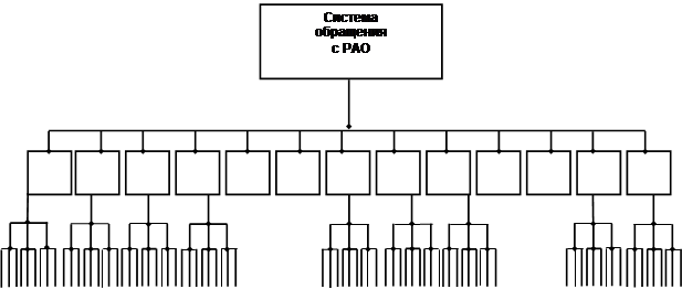 Промежуточная цель такой программы - установление системы нормативного регулирования безопасности при обращении с РАО. Система обращения с РАО в России со всем многообразием источников образования РАО видов накопленных и образующихся РАО и видов деятельности с ними достаточно сложна для анализа, поэтому было целесообразно ее расчленить на подсистемы* и элементы. Наиболее рациональным в целях настоящей работы было расчленение всей системы обращения с РАО на функциональные подсистемы - группы объектов, на которых обращаются с РАО, и последующее расчленение каждой из функциональных подсистем на подсистемы по видам накопленных и образующихся РАО (агрегатное состояние, уровень активности, радионуклидный состав и т.п.), которые, в свою очередь, подразделялись на элементы. В качестве элемента системы обращения с РАО принята простейшая неделимая с точки зрения поставленной цели часть системы - конкретный вид деятельности (способ обращения) с определенного вида РАО, требующий регламентации. С точки зрения системы нормативного регулирования безопасности при обращении с РАО элементом является регулирующее воздействие на каждый конкретный вид деятельности с РАО. В результате такого расчленения системы обращения с РАО (декомпозиции системы в пространстве) ее можно представить в виде древовидной иерархической структуры (рис.2).