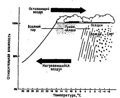 Рис. 1.1. Влияние температуры на относительную влажность воздуха (по Б.Небелу, 1993) При неизменном количестве воды в воздухе относительная влажность увеличивается, когда температура падает. Если воздух охлаждается до температуры ниже точки водонасыщения (100%), происходит конденсация и выпадают осадки. При нагревании его относительная влажность падает. Сочетание температуры и влажности часто играет решающую роль в распределении растительности и животных. Взаимодействие температуры и влажности зависит не только от относительной, но и от абсолютной их величины. Например, температура оказывает более выраженное влияние на организмы в условиях влажности, близкой к критической, т.е. если влажность очень велика или очень мала. Влажность также играет более критическую роль при температуре, близкой к предельным значениям. Отсюда одни и те же виды организмов в различных географических зонах предпочитают разные местообитания. Так, по правилу предварения, установленному В. В. Алехиным (1951) для растительности, широко распространенные виды на юге произрастают на северных склонах, а на севере встречаются только на южных (рис. 1.2).