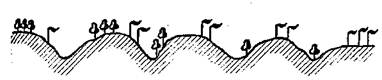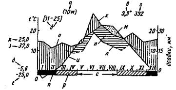 Рис. 1.2. Схема правила предварения (по В. В. Алехину, 1951): 1 — северный вид, обитающий на плакоре, на юге переходящий на склоны северной экспозиции и в балки; 2 — южный вид, на севере встречающийся на наиболее прогреваемых склонах южной экспозиции Для животных выявлены принципы смены местообитание (Г. Я. Бей-Биенко, 1961) и принцип смены ярусов (М. С. Гиляров, 1970), согласно которым мезофильные виды в центре ареала, на севере его выбирают более сухие, а на юге — более влажные места или переходят от наземного образа жизни к подземному, как многие насекомые-фитофаги. Чем слабее проявляется влияние климата в тех конкретных местообитаниях, которые выбирает вид, тем больше их способность обитать в разных климатических условиях. Вид выбирает сочетание факторов, наиболее соотгветсгвующих его экологической валентности, путем смены местообитания, и таким образом преодолевает климатические рубежи. t Взаимосвязь температуры и влажности хорошо отражают кли-мадиаграммы, составленные по способу Вальтера-Госсена, на вторых в определенных масштабах сопоставлен годовой ход температуры воздуха с ходом выпадения осадков (рис. 1.3 ). . Климадиаграммы можно построить для отдельных лет, а расположив последовательно и непрерывно одна за другой, получить климатограмму. На климатограммах легко прослеживается экстремально сухие или экстремально холодные годы.