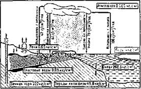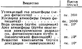 Табл. 4.1. — Время, достаточное для полного оборота вещества В круговороте участвуют химические элементы и соединения, более сложные ассоциации вещества и организмы. Процессы изменения вещества могут носить преим. характер механического перемещения, физико-химич. превращения, ещё более сложного биологического преобразования или носить смешанный характер. Круговорот веществ, как и отдельные цикличные процессы на Земле, поддерживаются притекающей к ним энергией. Её основными источниками являются солнечная радиация, энергия положения (гравитационная) и радиогенное тепло Земли, когда-то имевшее исключит, значение в происходивших на Земле процессах. Энергия, возникшая при химических и других реакциях, имеет второстепенное значение. Для отдельных частных круговоротов вещества можно оценить затраченную энергию; напр., для ежегодного испарения масс воды с поверхности океана расходуется около 10,5*1023 дж (2,5*1023 кал), или 10% от всей получаемой Землёй энергии Солнца. Классификация круговорота веществ на Земле ещё не разработана. Можно говорить, например, о круговоротах отдельных хнмических элементов или о биологическом круговороте веществ в биосфере; можно выделить круговорот газов атмосферы или воды, твёрдых веществ в литосфере и, наконец, круговорот веществ в пределах 2—3 смежных геосфер. Изучением круговорота веществ занимались многие русские учёные. В. И. Вернадский выделил геохимическую группу т, н. циклических химических элементов; к ним относят практически все широко распространённые и многие редкие хнмические элементы, например углерод, кислород, азот, фосфор, серу, кальций, хлор, медь, железо, йод. В. Р. Вильяме и мн. др. рассматривали биологические циклы азота, углекислоты, фосфора и др. в связи с изучением плодородия почв. Из циклич. хнмич. элементов особенно важную роль в биогенном цикле (см. Биогеохимия) играют углерод, азот, фосфор, сера. 4.1.3. Углерод.Углерод — основной биогенный элемент; он играет важнейшую роль в образовании живого вещества биосферы. Углекислый газ из атмосферы в процессе фотосинтеза, осуществляемого зелёными растениями, ассимилируется и превращается в разнообразные и многочисленные органические соединения растений. Растительные, организмы, особенно низшие микроорганизмы, морской фитопланктон, благодаря исключительной скорости размножения продуцируют в год ок. 1,5*1011 т углерода в виде органической массы, что соответствует 5,8б*1020 дж (1,4-1020 кал) энергии. Растения частично поедаются животными (при этом образуются б. или м. сложные пищевые цепи). В конечном счёте органическое вещество в результате дыхания организмов, разложения их трупов, процессов брожения, гниения и горения превращается в углекислый газ или отлагается в виде сапропеля, гумуса, торфа, которые, в свою очередь, дают начало мн. др. каустобиолитам — каменным углям, нефти, горючим газам (рис. 4.2).