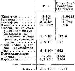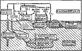 Рис. 4.2. Схема круговорота углерода. Содержание углерода дано в г/см2 поверхности Земли. Обмен углерода дан в f (l*10-6 г) на 1 см2 поверхности Земли в год. В процессах распада органических веществ, их минерализации огромную роль играют бактерии (напр., гнилостные), а также мн. грибы (напр., плесневые). В активном круговороте углерода участвует очень небольшая часть всей его массы (табл. 4.2).
