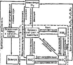 Табл. 2.— Содержание углерода на поверхности 3 е м л и и в земной коре (16 км мощности). Огромное кол-во угольной к-ты законсервировано в виде ископаемых известняков и др. пород. Между углекислым газом атмосферы и водой океана, в свою очередь, существует подвижное равновесие. Многие водные организмы поглощают углекислый кальций, создают свои скелеты, а затем из них образуются пласты известняков. Из атмосферы было извлечено и захоронено в десятки тысяч раз больше углекислого газа, чем в ней находится в данный момент. Атмосфера пополняется углекислым газом благодаря процессам разложения органических вещества, карбонатов и др., а также, всё в большей мере, в результате индустриальной деятельности человека. Особенно мощным источником являются вулканы, газы которых состоят главным образом из углекислого газа и паров воды. Некоторая часть углекислого газа и воды, извергаемых вулканами, возрождается из осадочных пород, в частности известняков, при контакте магмы с ними и их ассимиляции магмой. В процессе круговорота углерода происходит неоднократное фракционирование его по изотопному составу (12С — 13С), особенно в магматогенном процессе (образование СО2, алмазов, карбонатов), при биогенном образовании органические вещества (угля, нефти, тканей организмов и др.). 4.1.4. Круговорот азотаИсточником азота на Земле был вулканогенный NH3, окисленный О2 (процесс окисления азота сопровождается нарушением его изотопного состава—UN — 15N). Основная масса азота на поверхности Земли находится в виде газа (N2) в атмосфере. Известны два пути его вовлечения в биогенный круговорот (рис. 4.3):