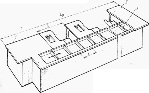 Рис. .1. Однолинейный ритмичный ленточный конвейер: 1 — место запуска; 2 — место выпуска изделий; 3 — конвейерная лента поделенная на ячейки 2. Сущность и область применения последовательно-ассортиментного способа запуска. Привести пример. Характеристика потоков по способу запуска. В узкоспециализированных одномодельных потоках используют последовательный запуск. В многомодельных и многоассортиментных потоках запуск изделий может осуществляться различным путем. Наибольшее применение в швейной промышленности имеют три способа запуска: цикличный, последовательно-ассортиментный и комбинированный (последовательно-цикличный). При цикличном запуске изделия на поток запускают по циклам. Например, в трехмодельном потоке при изготовлении моделей А, Б, В запуск может осуществляться по схеме А, Б, В; А, Б, В; А, Б, В и т. д. или А, А, Б, В; А, А, Б, В и т. д. В первом случае при цикле А, Б, В выпуск изделий по моделям одинаков, во втором случае выпуск модели А составит 50 % общего выпуска, а моделей Б и В — по 25%. При цикличном запуске выпуск по моделям может изменяться в кратном соотношении. Цикличный запуск с поштучным питанием используют в конвейерных потоках со строгим ритмом. В неконвейерных потоках возможно использование цикличного запуска с пачковым питанием. Такой запуск называют циклично-пачковым. При последовательно-ассортиментном способе (ПАЗ) запуск изделий на поток осуществляют последовательно, т. е. в каждый отдельный момент поток является специализированным, а в течение одной или нескольких смен происходит перезаправка с одного изделия или модели на другие. Так, в трехмодельном потоке с последовательно-ассортиментным запуском модель А запускают на протяжении времени rа; модель Б — на протяжении времени RБ и модель В — на протяжении времени Rв- При этом