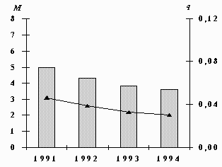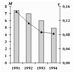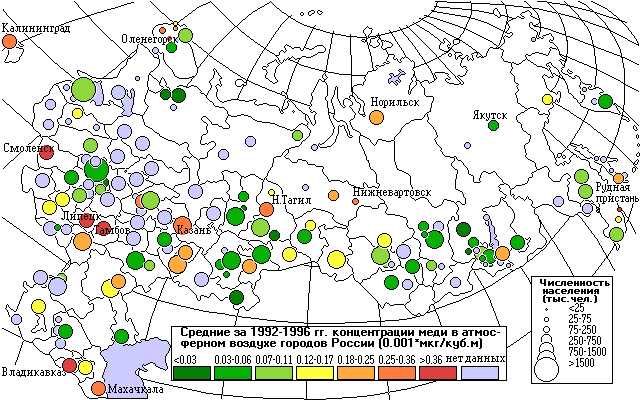 Выбросы М (тыс.т/год) оксида меди и среднегодовые концентрации q (мкг/м3) меди. Медь поступает в воздух с выбросами металлургических производств. В выбросах твердых веществ она содержится в основном в виде соединений, преимущественно оксида меди. На долю предприятий цветной металлургии приходится 98,7 % всех антропогенных выбросов этого металла, из них 71% осуществляется предприятиями концерна “Норильский никель”, расположенными в Заполярном и Никеле, Мончегорске и Норильске, а еще примерно 25% выбросов меди осуществляются в Ревде, Красноуральске, Кольчугино и в других. В Как видно из карты, самые высокие концентрации меди отмечены в городах Липецк и Рудная Пристань. Повышены также концентрации меди в городах Кольского полуострова, в Заполярном, Мончегорске, Никеле, Оленегорске, а также в Норильске. Выбросы меди от промышленных источников снизились на 34%, средние концентрации – на 42%. Молибден Соединения молибдена попадают в поверхностные воды в результате выщелачивания их из экзогенных минералов, содержащих молибден. Молибден попадает в водоемы также со сточными водами обогатительных фабрик, предприятий цветной металлургии. Понижение концентраций соединений молибдена происходит в результате выпадения в осадок труднорастворимых соединений, процессов адсорбции минеральными взвесями и потребления растительными водными организмами. Молибден в поверхностных водах находится в основном в форме МоО42-. Весьма вероятно существование его в виде органоминеральных комплексов. Возможность некоторого накопления в коллоидном состоянии вытекает из того факта, что продукты окисления молибденита представляют рыхлые тонкодисперсные вещества. В речных водах молибден обнаружен в концентрациях от 2.1 до 10.6 мкг/дм3. В морской воде содержится в среднем 10 мкг/дм3 молибдена. В малых количествах молибден необходим для нормального развития растительных и животных организмов. Молибден входит в состав фермента ксантиноксидазы. При дефиците молибдена фермент образуется в недостаточном количестве, что вызывает отрицательные реакции организма. В повышенных концентрациях молибден вреден. При избытке молибдена нарушается обмен веществ. Предельно допустимая концентрация молибдена в водоемах санитарно-бытового использования составляет 0.25 мг/дм3. Мышьяк В природные воды мышьяк поступает из минеральных источников, районов мышьяковистого оруднения (мышьяковый колчедан, реальгар, аурипигмент), а также из зон окисления пород полиметаллического, медно-кобальтового и вольфрамового типов. Некоторое количество мышьяка поступает из почв, а также в результате разложения растительных и животных организмов. Потребление мышьяка водными организмами является одной из причин понижения концентрации его в воде, наиболее отчетливо проявляющегося в период интенсивного развития планктона. Значительные количества мышьяка поступают в водные объекты со сточными водами обогатительных фабрик, отходами производства красителей, кожевенных заводов и предприятий, производящих пестициды, а также с сельскохозяйственных угодий, на которых применяются пестициды. В природных водах соединения мышьяка находятся в растворенном и взвешенном состоянии, соотношение между которыми определяется химическим составом воды и значениями рН. В растворенной форме мышьяк вс