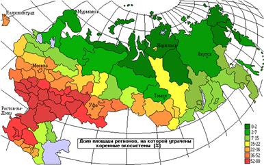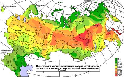 На приведенной карте видно, что потенциальная устойчивость экосистем России практически всюду в той или иной степени снижена за счет замены коренных типов экосистем, менее устойчивыми антропогенными производными (агроценозами или вторичными лесами) или полным уничтожением при застройке и урбанизации. При этом максимальные по площади воздействия характерны именно для районов с самыми устойчивыми природными комплексами. В России говорят: - “Кто везет, на того и валят”. Устойчивые экосистемы южной тайги и лесостепи России сохраняли возможность достаточно автономного, без подпитки со стороны, развития индустриальной цивилизации последних полутора веков несмотря на максимальную утрату природных комплексов. Степи Европейской части России были вторично (после заброса в период серьезной угрозы со стороны степных кочевников в XIII - XVII вв.) освоены в XVIII - XIX вв., то есть уже на фоне достаточно высоко развитого в техническом отношении сельского хозяйства. С другой стороны, обладая наиболее высокой и стабильной урожайностью, эти степи испытали в социалистический период наиболее тяжелые последствия погони за ростом пахотного клина, “борьбы с травопольной системой” и т.п. В то же время запас устойчивости экосистем обеспечивал возможности хозяйственного развития при кардинальной модернизации и повышении энерговооруженности человека. Характерно, что районы с высокой устойчивостью природных условий в значительной степени коррелируют с районами высокой устойчивости (жизнеспособности) социума. Напротив, в более южных степях и полупустынях (Прикаспий) и на Севере - в тундрах природные условия из-за собственной неустойчивости биоты существенно ограничивают произвол человека в выборе вариантов и интенсивности хозяйственной деятельности. Соответственно, и социум этих регионов гораздо менее устойчив. Именно с этим связано преимущественное сохранение в сухих степях, полупустынях, тундрах и северной тайге традиционных форм природопользования. Индустриальная цивилизация здесь присутствует обычно в форме анклавов, существование которых возможно лишь при постоянной поддержке (ресурсами, людьми, энергией) из более устойчивых районов. Эти анклавы выглядят как инородное тело внутри региона и наиболее разрушительно воздействуют на его природу. Несмотря на высокий уровень устойчивости экосистем южной тайги и лесостепи Европейской России, угроза утраты природного баланса и непрогнозируемого разрушения всех форм хозяйствования (особенно сельского хозяйства) этих районов были осознаны еще в сталинский период. В конце 40-х гг. был принят план массового создания лесополос и искусственных водоемов. Реализация плана должна была существенно повысить устойчивость экосистем степей юга России. К сожалению, план не был реализован полностью. Но даже в своей реализованной части он не полностью достиг желаемых результатов, так как часть лесополос была высажена “гнездовым методом” Т.Д.Лысенко и погибла практически сразу же, на создание же прудов с самого начала не отпускалось достаточных средств и они по большей части были прорваны первым же высоким паводком. По мере того, как план забывался, а дефицит хлеба в стране возрастал, началось массовое сведение лесополос - крупными тракторами удобнее обрабатывать крупные массивы и лесополосы 