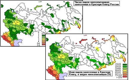 По современным оценкам флора сосудистых растений России составляет 11400 видов, причем ее инвентаризация далеко неполна. В Красную книгу внесено 440 видов покрытосеменных, 11 видов голосеменных и 10 видов папоротникообразных растений, то есть 4% флоры. Эксперты считают, что реально той или иной степени опасности подвергается не менее 2 - 3 тыс. видов сосудистых растений. Обилие видов сосудистых растений, внесенных в Красную книгу России достаточно оригинально. Помимо максимумов в центрах повышенного биологического разнообразия, куда заходят виды с сопредельных территорий (Кавказ, горы юга Сибири, Приморье, Сахалин и Курилы), имеются и региональные центры, не имеющие аналогов у других групп. Повышенное число редких видов растений характерно для степной зоны (обычно 15 - 30 видов), что, безусловно, обусловлено ее глубокой антропогенной трансформацией. Локальный максимум существует на Чукотке (11 видов) за счет проникновения сюда ряда американских видов, а также на южных берегах Финского залива и его остовах (27 видов), где произрастает значительное число западноевропейских растений. На огромных пространства Северной Сибири редких видов растений неизвестно. Максимальное число редких видов растений наблюдается в Приханкайской низменности - 66 и на западной оконечности российской части Кавказа - 65. Фауна беспозвоночных животных России до сих пор изучена очень слабо. Практически по всем классам мы имеем лишь оценку общего числа видов. В настоящее время число видов беспозвоночных России оценивается в 135,2 тыс., из которых на членистоногих приходится 120 тыс., в том числе на насекомых - 100 тыс. В первом издании Красной книги России было 49 видов беспозвоночных животных, в списке ко второму изданию - уже 155. Однако, этот список скорее отражает уровень изученности отдельных групп беспозвоночных животных, чем реальную ситуацию с угрожаемыми видами. Так, из 128 видов насекомых 85 приходятся на жуков и бабочек - безусловно, наиболее изученных и заметных насекомых. С другой стороны, в списке отсутствуют паукообразные, хотя уязвимость этих животных при пестицидном загрязнении среды известна. Поэтому данный список представляет собой первое приближение к выявлению реальной картины уязвимой фауны беспозвоночных России. Позвоночные животные России изучены несоизмеримо лучше, по всем классам мы имеем достаточно надежные инвентаризации фаун. В фауне России (за исключением морских рыб) отмечено 1471 вид позвоночных животных, их которых 270 видов (18,4%) предполагается внести во второе издание Красной книги России. Круглоротые. В России обитает всего 8 видов этого класса, но это 40% его видового разнообразия. Все виды миног, населяющие Европейскую часть России, находятся под угрозой. В Красную книгу предполагается внести 4 вида. Рыбы - наименее изученный класс позвоночных животных России. В пресных водах встречается 269 видов рыб, в прибрежных морских водах - еще не менее 400 видов. Но это составляет всего около 2% видового разнообразия класса. 22 вида пресноводных рыб (8.2%) встречаются только в России. В первом издании Красной книги России было включено 9 таксонов, во второе предполагается включить уже 44 таксона рыб. Следует отметить, что так, как российская ихтиология развивалась прежде всего на изучении рыбных промыслов, для нее характерен подход по “стадам” рыб - то есть