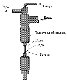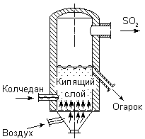 Рис. 18. Схема печи для обжига пирита в кипящем слое. Широко применяется для сжигания пирита (равно как и для проведения многих других технически важных процессов) метод “кипящего слоя”. Работа по этому методу осуществляется путём продувания подаваемой снизу сильной струи воздуха сквозь массу достаточно измельченного твердого вещества (или смеси веществ), Благодаря громадной общей реакционной поверхности поддерживаемых во взвешенном состоянии твёрдых частиц реакции протекают быстро и полностью. Печь для обжига пирита показана на рис. 18. Температура в кипящем слое поддерживается на уровне 900 °С; отходящий газ содержит до 14 % SO2.В качестве исходного сырья для производства серной кислоты может быть использован природный сульфат кальция. При сильном нагревании его в смеси с коксом протекает эндотермическая реакция: CaSO4 + C + 392,92 кДж = CO + SO2 + CaO Процесс проводят в цилиндрических вращающихся печах, прогреваемых сжиганием угольной пыли. Температура в печи достигает 1500 °С, отходящий газ содержит около 8 % SO2. Если в состав исходной шихты дополнительно вводить нужные количества глины и песка, то одновременно с каждой тонной вырабатываемой серной кислоты можно получать более тонны цемента. Общий ежегодный вынос SO2 с отходящими газами металлургических заводов исчисляется многими миллионами тонн (из которых половина падает на серу). Газы эти содержат обычно не более 5 % SO2. Для извлечения из них диоксида серы предварительно охлаждённые и обеспыленные газы пропускают сквозь раствор смеси сульфита с бисульфитом, содержащий соли алюминия. Такой раствор хорошо поглощает диоксид серы на холоду и вновь выделяет её при нагревании. Роль солей алюминия сводится к повышению кислотности среды при нагревании за счёт резкого увеличения их гидролиза. В основе другого метода улавливания диоксида серы из отходящих газов ( в том числе дымовых) лежит реакция (NH4)2SO3 + SO2 + H2O Ы 2 NH4HSO3 равновесие которой смещается вправо на холоду и затем влево при нагревании под вакуумом. Следует отметить очень значительное поступление диоксида серы в атмосферу при сжигании содержащих серу топлив.