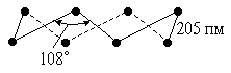 Рис. 3. Строение цепи (ВО2)nn-. Выделяемые из растворов метабораты обычно содержат кристаллизационную воду. Возможно, что на самого деле они являются кислыми ортоборатами. В частности, для Са(ВО2)2·2Н2О (правильнее структура Са(НВО3)2. Неизвестной в свободном состоянии тетраборной кислоте (К1=2·10-4, К2=2·10-5) может быть придана структурная формула (рис. 2). Для её натриевой соли, помимо обычной буры, характерен также кристаллогидрат Na2B4O7·5H2O (“ювелирная бура”), осаждающийся из растворов выше 56 °С и на воздухе не выветривающийся. Насыщенный водный раствор буры содержит около 2,5 % тетрабората натрия при обычных условиях (рН = 9,3) и около 33 % при 100 °С. Бура растворима также в спирте и глицерине. Безводный Na2B4O7 (т. пл. 741 °С) может быть получен нагреванием буры выше 400 °С (но образующаяся первоначально аморфная фаза закристаллизовывается лишь при 675 °С). Бура потребляется рядом различных производств (стекольным, керамическим, кожевенным и др.). Она находит также медицинское использование (как дезинфицирующее средство) и входит в состав некоторых стиральных порошков. Из солей различных полиборных кислот многие встречаются в природе и служат исходными продуктами для получения соединений бора. Таков, например, минерал гидроборацит — СаМgB6O11·6H2O, производящийся от гексаборной кислоты (n = 3, m = 2). Наряду с солями полиборных кислот, являющихся изополикислотами бора, известны также производные некоторых его гетерополикислот, например H9[B(W2O7)6]. Последняя отвечает неизвестному в свободном состоянии гидрату H9BO6 (т. е. B2O3·9H2O). Перевод солей других кислот в бораты путём их сплавления с избытком H3BO3 происходит при различных температурах, например, для KNO3 при 500, для KCl при 800 и для K2SO4 при 1000 °С. Бораты образуются также при сплавлении солей или оксидов с бурой, например, по схеме: Na2B4O7 + CoO = 2 NaBO2 + Co(BO2)2. Так как бораты некоторых металлов характерно окрашены, растворы их в расплавленной буре образуют цветные стёкла (например, синее для кобальта или зелёные для хрома). Этим пользуются иногда в аналитический химии для открытия таких металлов. Обычно реакцию проводят в ушке платиновой проволочки, причём получается окрашенная капля борного стекла (“перл буры”). Помимо буры и борной кислоты некоторое практическое значение имеют также соли надборных кислот (пербораты), образующиеся путём замены атомов кислорода в борате на пероксидные группы -О-О-. Свободные надборные кислоты не выделены, но в растворах они существуют. На это указывает заметное повышение кислотности растворов Н3ВО3 при добавлении к ним Н2О2 (для К1 даётся значение 2·10-8). Чаще всего встречается в практике перборат состава NaBO3·4H2O может быть получен действием H2O2 на раствор метабората натрия и представляет собой бесцветные кристаллы, сравнительно малорастворимые в воде (около 25 г/л при обычных условиях). По данным рентгеноструктурного анализа, строение этой соли отвечает формуле Na2[(HO)2B(O2)2B(OH)2]·6H2O, т. е. она является производным истинной надборной кислоты. Вместе с тем, в отличие от солей других надкислот, она не выделяет иод из раствора KI. На этом основании её обычно трактовали как метаборат натрия, содержащий кристаллизационный пероксид водорода, т. е. NaBO21·H2O2·3H2O. По-видимому, в растворе этой соли имеет место сильно смещённое вправо гидролитическое равновесие по схемам: Na2[(OH)2B(O2)2B(OH)2] + 4 H2O Ы 2 Na[(HO)2BO2] + 4 H2O Ы 2 Na[B(OH)4] + 2 H2O2, чем и