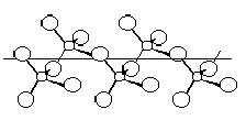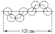 Рис. 10. Схема структуры (SO3)3. Рис. 11. Схема цепи (SO3)n. Для хранения и транспортировки больших количеств наиболее удобна жидкая форма серного ангидрида (т. кип. 43 °С), которая сама по себе может быть устойчивой лишь при полном исключении даже ничтожных следов влаги. Стабилизация ее достигается введением специальных добавок (SOСl2, В2О3 и др.). При действии измельчённой серы на тщательно защищённый даже от следов воды жидкий SO3 осаждаются зеленовато-синие кристаллы сесквиоксида серы (S2O3). Оксид этот весьма неустойчив и сам по себе, а водой тотчас разлагается с выделением серы. Его самопроизвольный распад при обычных температурах идет в основном по схеме: 2 S2O3 = 3 SO2 + S. Строение его отвечает, вероятно, формуле OS=SO2. Триоксид серы характеризуется сильными окислительными свойствами (восстанавливаясь обычно до SO2). С другой стороны он является кислотным ангидридом, причём образование H2SO4 из SO3 и воды сопровождается большим выделением тепла: H2O + SO3 = H2SO4 + 63 кДж Чистая 100 %-ная серная кислота (моногидрат) представляет собой бесцветную маслянистую жидкость, застывающую в кристаллическую массу при +10 °С. Реактивная серная кислота имеет обычно плотность 1,84 г,см3 и содержит около 95 % H2SO4. Затвердевает она лишь ниже -20 °С.