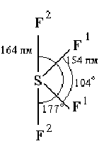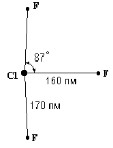 Рис. . Строение молекулы ClF3. он соединяется почти со всеми металлами (иногда лишь в присутствии следов воды или при нагревании) и со всеми металлоидными элементами, кроме С, N и O. Важно отметить, что при полном отсутствии влаги хлор не действует на железо. Это и позволяет хранить его в стальных баллонах.Взаимодействие хлора с фтором при нагревании смеси сухих газов происходит лишь выше 270 °С. В этих условиях с выделением тепла (50 кДж/моль) образуется бесцветный хлорфторид — С1F (т. пл. -156, т. кип. -100 °C). Газообразный С1F обладает сильным своеобразным запахом (отличным от запахов хлора и фтора). Взаимодействием хлорфторида с фторидами Сs, Rb и К под высоким давлением были получены бесцветные малостойкие соли типа МС1F2, содержащие в своем составе линейный анион С1F2-. При нагревании они экзотермически разлагаются около 250 °С. Нагреванием ClF с избытком фтора может быть получен бледно-зеленоватый трехфтористый хлор (хлортрифторид) — СlF3 (т. пл. -76, т. кип. +12 °С). Соединение это также экзотермично (теплота образования из элементов 159 кДж/моль) и по запаху похоже на С1F. Молекула С1F3 полярна (m = 0,55) и имеет показанную на рис. плоскую структуру. Последняя производится от тригональной бипирамиды, у которой два направления треугольного основания закрываются свободными электронными парами атома хлора. Критическая температура С1F3 равна 154 °С, плотность в жидком состоянии 1,8 г/см3, теплота испарения 27,6 кДж/моль. Вблизи точки кипения пар трехфтористого хлора несколько ассоциирован по схеме: 2 С1F3 Ы (С1F3)2 + 12,5 кДж. Для димера вероятна мостиковая структура (по типу F2С1F2С1F2). Жидкий С1F3 смешивается с жидким НF в любых соотношениях, причем имеет место слабое взаимодействие по схеме: НF + С1F3 Ы НС1F4 + 16,7 кДж. Образующийся ацидохлортетрафторид не выделен, но производящиеся от него соли типа МС1F4, (где М — Сs, Rb, К) известны. По-видимому, они могут быть получены не только прямым сочетанием МF и С1F3, но и фторированием соответствующих хлоридов (3000 атм, 300 °С). Нагреванием смеси С1F3 с избытком фтора под высоким давлением может быть получен бесцветный хлорпентафторид — С1F5 (т. пл. -93, т. пл. -13 °С). Теплота его образования из элементов 251 кДж/моль. Молекула С1F5, имеет строение квадратной пирамиды из атомов фтора, вблизи основания которой располагается атом хлора. В отсутствие влаги этот газ при обычных условиях устойчив, а водой разлагается. Он является энергичным фторирующим агентом, но корродирует металлы слабее, чем С1F3. Фториды хлора характеризуются исключительной реакционной способностью. Например, в парах С1F3 стеклянная вата самовоспламеняется. Почти столь же энергично взаимодействуют с ним и такие сами по себе чрезвычайно устойчивые вещества, как MgО, СаО, А12O3 и т. п. Так как С1F3 сжижается при обычных температурах уже под небольшим давлением и легко отщепляет фтор, его удобно использовать для транспортировки фтора. Помимо различных реакций фторирования, отмечалась возможность применения этого вещества как окислителя реактивных топлив и зажигательного средства в военной технике. По трифториду хлора имеется обзорная статья. Взаимодействие хлора с водородом по реакции: Н2 + С12 = 2 НС1 + 184 кДж при обычных условиях протекает крайне медленно, но нагревание смеси газов или ее сильное освещение (прямым солнечным светом, горящим магнием и т. д.) сопровождается взрывом. Детальное изучение этой р
