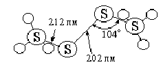 Рис. 22. Строение иона S2O82–. Свободная надсерная кислота представляет собой бесцветные гигроскопичные кристаллы. Строение её молекулы выражается формулой HO-SO2-O-O-SO2-OH, т. е. она содержит пероксидную цепочку. Пространственная структура отвечающего ей иона S2O82- показана на рис. 22. Каждая половина этого рисунка в отдельности соответствует строению сульфат-иона.Хотя окислительные свойства надсерной кислоты (т. пл. 65 °С, с разложением) выражены очень сильно, однако со многими восстановителями она при обычных температурах реагирует в растворах настолько медленно, что окисление практически не происходит. Характерным для H2S2O8 катализатором, резко ускоряющим подобные процессы, является ион Ag2+. В его присутствии надсерная кислота способна окислять Mn2+ до HMnO4. Интересно, что тиосульфат окисляется ею только до тетратионата (а не до сульфата). При взаимодействии H2S2O8 с концентрированным пероксидом водорода по уравнению H2S2O8 + H2O2 = 2 H2SO5 образуется мононадсерная кислота, по строению отвечающая серной кислоте, в которой один гидроксид замещён на группу OOH. В свободном состоянии эта кислота представляет собой бесцветные и весьма гигроскопичные кристаллы (т. пл. 47 °С с разложением). Мононадсерная кислота является ещё более сильным окислителем, чем надсерная, и взаимодействие её со многими органическими веществами (например, бензолом) сопровождается взрывом. Она устойчивее H2S2O8 в кислых средах и менее устойчива в нейтральных и щелочных. Особенно это относится к pH = 9, когда раствор содержит равные концентрации ионов HSO5– и SO52–. Соли H2SO5 малоустойчивы. В них кислота обычно фигурирует как одноосновная. Обусловлено это затруднённостью ионизации водорода группы –OOH (K2 = 5·10-10). Как следует из изложенного выше, обе надкислоты серы являются производными перекиси водорода. Сама H2O2 может быть легко получена из них, чем и пользуются в технике. Для этого подвергают электролизу концентрированную H2SO4, причём образующаяся вначале надсерная кислота быстро разлагается по реакции: H2S2O8 + H2O = H2SO4 + H2SO5 Вслед за тем медленно разлагается и мононадсерная кислота: H2SO5 + H2O = H2SO4 + H2O2 Образовавшуюся H2O2 отгоняют из реакционной смеси под уменьшенным давлением. Последняя из приведённых реакций заметно обратима, поэтому при смешивании концентрированных растворов H2O2 с концентрированной H2SO4 вновь образуется мононадсерная кислота. В отличие от перекиси водорода обе надкислоты серы не реагируют с подкисленным раствором KMnO4 и при pH = 7,5–8,0 окисляют KI до свободного иода. Их взаимодействие с H2O2 сопровождается выделением кислорода. Мононадсерная кислота хорошо растворима в эфире, надсерная — плохо. Растворимость K2S2O8 в воде составляет при обычных условиях около 45 г/л, а (NH4)2S2O8 — более 750 г/л. Легкорастворим в воде также BaS2O8. При нагревании персульфаты с отщеплением кислорода переходят в пиросульфаты. Длительным выдерживанием K2S2O8 над 65 %-ным олеумом может быть получен “надтетрасульфат” калия — K2S4O11. Эта бесцветная соль, сочетающая в себе особенности строения пиросульфата (связи S–O–S) и персульфата (связь S–O–O–S). Она энергично реагирует с водой, окисляет KI и обесцвечивает KMnO4). Потеря активного кислорода наступает при 130 °С, а около 250 °С начинается отщепление SO3. Кроме надкислот были описаны пероксиды серы. При действии тлеющего электрического разряда на сильно охлаждаемую смесь SO3 с больш