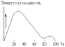 Рис. 13. Электропроводность растворов серной кислоты. Растворение концентрированной серной кислоты в воде сопровождается значительным выделением тепла (и некоторым уменьшением общего объёма системы). Моногидрат почти не проводит электрического тока. Напротив, водные растворы серной кислоты являются хорошими проводниками. Как видно на рис. 13, максимальной электропроводностью обладает приблизительно 30 %-ная кислота. Минимум кривой соответствует гидрату состава H2SO4·H2O.Выделение тепла при растворении моногидрата в воде составляет (в зависимости от конечной концентрации раствора) до 84 кДж/моль H2SO4. Напротив, смешиванием 66 %-ной серной кислоты, предварительно охлажденной до 0 °С, со снегом (1:1 по массе) может быть достигнуто понижение температуры, до -37 °С. Для серной кислоты известно несколько кристаллогидратов, состав которых показан на рис. 14. Из них наиболее бедный водой представляет собой соль оксония: H3O+HSO4–. Так как рассматриваемая система очень склонна к переохлаждению, фактически наблюдаемые в ней температуры замерзания лежат гораздо ниже температур плавления.
