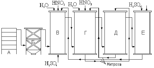 Рис. 19. Схема башенного метода получения серной кислоты. Нитрозный метод получения H2SO4 был впервые применён в середине XVIII века. Его химическая сущность может быть выражена следующими реакциями: I. SO2 + H2O + NO2 = H2SO4 + NO II. 2 NO + O2 = 2 NO2 Из первого уравнения видно, что являющийся окислителем диоксид азота NO2 восстанавливается до монооксида NO, а последний при взаимодействии с кислородом воздуха по второму уравнению вновь даёт диоксид. Таким образом, NO играет роль переносчика кислорода, т. е. по существу катализатором реакции окисления SO2 кислородом воздуха. До 20-х годов текущего века процесс получения серной кислоты нитрозным методом проводился в больших свинцовых камерах (камерный метод). Теперь он осуществляется в специальных башнях (башенный способ). Получаемая по башенному способу кислота, как правило, содержит 76 % H2SO4 и несколько загрязнена различными примесями. Основным потребителем этой кислоты является промышленность минеральных удобрений. Принципиальная схема башенного способа получения H2SO4 показана на рис. 19. Башни выкладываются из кислотоупорных керамических плит с наружным кожухом из листовой стали. Внутри они неплотно заполнены насадкой из кислотоупорной керамики. Поступающий из печи для сжигания пирита (А) газ освобождается от пыли в электрофильтре (Б) и затем подаётся в продукционные башни (В и Г), где встречается со стекающей сверху “нитрозой”, т. е. раствором оксидов азота в концентрированной серной кислоте. Раствор этот характеризуется следующими равновесиями: NO + NO2 + 2 H2SO4 Ы N2O3 + H2SO4 Ы 2 NOHSO4 + H2O Таким образом, нитроза содержит оксиды азота и химически связанные (в виде HSO3NO2 — т. н. нитрозилсерной кислоты), и просто растворённые. Следует отметить, что окисление SO2 осуществляется только последними. При нагревании приведённые равновесия смещаются влево, при охлаждении — вправо. В продукционных башнях, куда поступает горячий газ (а также подается вода), нитрозилсерная кислота полностью разлагается и происходит окисление практически всего вводимого сернистого газа. Готовая продукция отбирается из первой башни (В). В поглотительных башнях (Д и Е) происходит улавливание оксидов азота с образованием нитрозы, вновь подаваемой затем в продукционные башни. Выхлопные газы (свободный азот и др.) удаляются через верхнюю часть последней поглотительной башни (Е). Движение газов в системе поддерживается при помощи мощного вентилятора. Для компенсации некоторой потери оксидов азота в продукционные башни вводится азотная кислота. Другой современный метод получения серной кислоты — контактный — освоен промышленностью лишь в конце прошлого столетия. Основой его является упоминавшаяся выше реакция: 2 SO2 + O2 Ы 2 SO3 + 196 кДж В присутствии платинового катализатора она около 400 °С протекает слева направо практически полностью. Образующийся SO3 улавливают крепкой серной кислотой. Стоимость производства по контактному способу несколько выше, чем по нитрозному, зато серная кислота получается сколь угодно крепкой и очень чистой. Последнее обусловлено тщательной предварительной очисткой образующихся при сжигании пирита газов, что необходимо для обеспечения нормальной работы катализатора. Основными потребителями контактной серной кислоты являются различные химические производства и нефтепромышленность (для очистки нефтепродуктов). Для кон