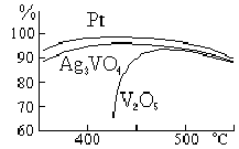Рис. 21. Выход SO3 на катализаторах контактного метода. Принципиальная схема получения серной кислоты контактным способом показана на рис. 20. Образующиеся в печи (А) газы последовательно проходят сквозь сухой электрофильтр (Б), увлажнительную башню (В), влажный электрофильтр (Г), осушительную башню (Д), содержащий катализатор окислительного процесса контактный аппарат (Е) и поглотительную башню (Ж). Из нижней части последней отбирается полученный олеум, а из верхней удаляются выхлопные газы (азот и др.). Большинство контактных заводов работает в настоящее время не с платиновыми, а со значительно более дешёвыми ванадиевыми катализаторами (V2O5, Ag3VO4 и др.), активность которых при реакции образования SO3 также весьма велика (рис. 21). Чаще всего применяют V2O5 с различными добавками (SiO2, KOH и др.).Растворы SO3 в серной кислоте дымят на воздухе вследствие выделения паров серного ангидрида. Поэтому содержащая растворённый SO3 серная кислота называется “дымящей” (иначе — “олеумом”). Так как H2SO4 растворяет серный ангидрид в любых соотношениях, выраженный формулой H2SO4·xSO3 состав олеума может быть различным. При х = 1, образуются бесцветные кристаллы пиросерной кислоты H2S2O7, строение которой сокращённо выражается формулой HO-SO2-O-SO2-OH. Соли её (пирофосфаты) могут быть получены нагреванием соответствующих бисульфатов, например, по реакции: 2 KHSO4 = H2O + K2S2O7 Они представляют собой бесцветные кристаллические вещества, под действием воды переходящие обратно в гидросульфаты. В продажу олеум обычно поступает с содержанием растворённого SO3 не 6олее 25 %, т. е. значительно меньшим, чем то отвечает пиросерной кислоте (45 вес. %). Кристаллы последней плавятся при 35 °С и очень гигроскопичны. Накаливание пиросульфатов ведёт к отщеплению ими SO3, например, по схеме: Na2S2O7 = Na2SO4 + SO3. Были получены также соли (K, Na, NH4) фторопиросерной кислоты — HS2O6F. При взаимодействии SO3 с HClO4 образуется, по-видимому, чрезвычайно взрывчатое соединение. Ему приписывается формула [ClO3+] [HS2O7–]. Если это действительно так, то пиросерная кислота оказывается даже сильнее хлорной. Действием SO3 на Na2S2O7 может быть получен Na2S3O10. Соответствующей этой соли “трисерной” кислоте H2S3O10 отвечает структурная формула HO–SO2–O–SO2–O–SO2–OH. При обычных температурах Na2S3O10 устойчивее пиросульфата и переходит в него с отщеплением SO3 лишь выше 150 °С. У солей Ca, Sr и Ba такой переход происходит около 75 °С. Интересным производным H2S3O10 является красный взрывчатый (ClO2)2S3O10 (т. пл. 75 °С), который может быть получен взаимодействием KClO3 с избытком SO3. По-видимому, способны существовать также производные кислот H2S4O13 и H2S5O16. В самом олеуме предполагаются равновесия по общей схеме: H2SO4 + n SO3 Ы H2Sn+1O3n+4 (где n = 1 , 2 или 3). При взаимодействии иода с олеумом образуются синие растворы. Результаты изучения их свойств говорят о наличии окислительно-восстановительного равновесия по схеме: I2 + H2S2O7 + 3 SO3 Ы 2 I+ + 2 HS2O7– + SO2 или 2 I2 + H2S2O7 + 3 SO3 Ы 2 I2+ + 2 HS2O7– + SO2. Вероятно, не исключена и возможность равновесия по схеме: I2 + SO3 Ы I2SO3 Ы I+ + ISO3– Интересно, что цвет рассматриваемых растворов иода такой же, как и у его аддукта с крахмалом. Если насыщенный раствор гидросульфата калия подвергнуть электролизу, то на катоде происходит выделение водорода и накопление КОН, а на аноде по схеме: 2 HSO4– - 2 e- = H2S2O8 образуется надсерная кислота. Получающийся в результате последующей нейтрализации H2S2O8 (пе