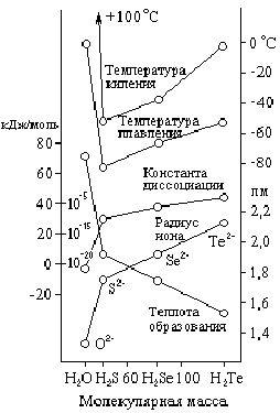 Рис. 3. Свойства водородных соединений элементов VI группы. Соединения теллура значительно менее ядовиты. В организме они быстро восстанавливаются до элементарного Те, который затем медленно выделяется в виде постепенно образующихся органических производных, обладающих сильнейшим чесночным запасом. Последний появляется после поступления в организм даже ничтожных количеств Те (десятимиллионных долей грамма). Известен случай, когда работавшим с теллуристыми соединениями химикам пришлось на несколько недель выселиться из города, так как исходивший от них запах был невыносим для окружающих. При лечении селеновых и теллуровых отравлений рекомендуется принимать в повышенных дозах витамин С (аскорбиновую кислоту).Недавно проведенными исследованиями установлено постоянное наличие следов полония в табачном дыме. Оказалось, что с дымом от пачки сигарет человек поглощает такую дозу облучения a-частицами, которая в 4 раза превышает признаваемую безопасной по международному соглашению. Анализ мочи курильщиков показал, что она содержит полония в 6 раз больше, чем у некурящих. Это значит, что полоний циркулирует по организму и может накапливаться (как и продукт его распада — свинец) не только в легких, но и в любом другом органе. Предполагается, что статистически установленная значительно большая частота заболеваний раком курильщиков по сравнению с некурящими обусловлена главным образом именно радиоактивностью полония. С химической стороны селен и теллур в общем похожи на серу. Из неметаллов они наиболее энергично взаимодействуют с фтором и хлором, а с кислородом соединяются лишь после предварительного нагревания. С газообразным водородом частично реагирует при повышенных температурах только селен, тогда как теллур с ним непосредственно не соединяется. Со многими металлами Se и Te дают при нагревании аналогичные сульфидам селениды и теллуриды (например, K2Se, K2Te). Действием на них разбавленных кислот могут быть получены селеноводород (H2Se) и теллуроводород (H2Te). Оба они при обычных условиях представляют собой бесцветные газы с неприятными запахами. Растворимость их в воде примерно такая же, как у сероводорода, причем растворы показывают ясно выраженную кислую реакцию. Некоторые свойства рассматриваемых соединений сопоставлены в приводимой ниже таблице и на рис. 3 с аналогичными свойствами H2O и H2S. Для приблизительной ориентировки в размерах соответствующих молекул приведены также радиусы ионов Э2–.