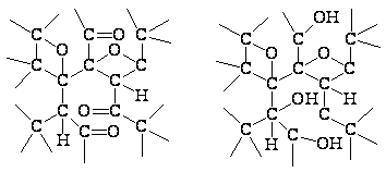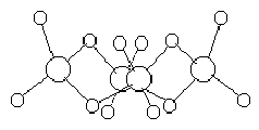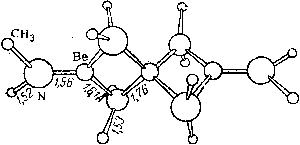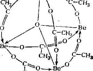 Рис. . Схема пространственного строения основного ацетата бериллия. Рис. . Валентвая схема основного ацетата бериллия. Как видно из рис. , центральный атом кислорода тетраэдрически окружён четырьмя атомами бериллия, а каждый из последних — четырьмя атомами кислорода. Помимо восьми обычных валентных связей в формировании молекулы участвуют 8 донорно-акцепторных связей О-Ве (рис. ). Получающаяся замкнутая структура так прочна, что кристаллизующийся в правильных октаэдрах основной ацетат бериллия не только плавится, но и кипит без разложения (т. пл. 285, т. кип. 331 °С). Это используется для очистки бериллия от примеси многих других элементов. Основной ацетат нерастворим в воде, но растворяется в неполярных органических растворителях. Подобные ему производные бериллия известны и для некоторых других органических кислот. Вместе с тем, в отличие от Mg2+, А13+ и многих других катионов, Be2+ не имеет тенденции к комплексообразованию с “трилонами”. Обусловлено это, по-видимому, его очень малым радиусом. 61) Подобным основному ацетату неорганическим соединением бериллия является основной !!!!, который может быть получен термическим разложением Be(NO3)2 (в вакууме при 125 °С). Он представляет собой бесцветные летучие кристаллы, нерастворимые в неполярных органических растворителях. Известны и соли типа !!!! (где M-Na, К, NH4), строение аниона которых также аналогично основному ацетату бериллия. Для магния был выделен основной ацетат состава 4Mg(CH3COO)2·Mg(OH)2, при нагревании выше 200 °С разлагающийся до MgO. 62) Сходным по свойствам с основным ацетатом производным бериллия является его ацетилацетонат — !!!!. Он плавится при 108 °С и кипит без разложения при 270"С, почти нерастворим в воде, но хорошо растворяется в неполярных органических растворителях (СбНб, CSa и др.). Известен (но мало изучен) и ацетил- ацетонат магния. 63) Из циклопентадиенильных производных рассматриваемых элементов Ве(С5Н5)2 интересен своим строением: атом Be располагается между параллельными и отстояшими на 337 пм друг от друга плоскими кольцами C5H5 [с d(CC)= 143 н d(CH) = 110 пм], но на разных расстояниях от них [(ВеC) = 191 и 226 пм]. Возможно, что этой асимметрией и обусловлено наличие у Be(C5H5)2 дипольного момента !!!!. Сама она связана, вероятно, с ионным характером данного !!!! и малыми размерами Be2+, что создает возможность существования двух чётких минимумов на кривой его потенциальной энергии (при перемещении между кольцами). Аналогичный по составу циклопентадиенил магния — Mg(C5H5)2 — может быть получен прямым действием паров циклопентадиена на нагретый металл. Он представляет собой бесцветное кристаллическое вещество (т. пл. 177, т. кип. 221 °С), очень чувствительное не только к воде и воздуху, но даже к углекислоте. 64) Для многих безводных солей бериллия и магния характерно легкое образование комплексных аммиакатов. При обычных температурах для них типичны составы [Be(NH3)4]X2 и [Mg(NH3)4]X2 (где X — одновалентный анион). Некоторые аммиакаты довольно устойчивы по отношению к нагреванию. Например, давление аммиака над [Be(NH3)4]Cl2 при 156 °С равно лишь 6 мм рт. ст., а над !!!! оно достигает атмосферного лишь при 227 °С. Интересен гидразиновый комплекс !!!!, в котором бериллий имеет, по-видимому, необычное для него координаанонное число 6. Вероятно, таково же оно и в устойчивом лишь при низких температурах (давление аммиака достигает 90 мм рт. ст. уже при -50°С) ам