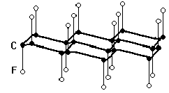 Рис. 3. Схема структуры слоя CF. Рис. 4. Схемы структуры слоёв в продуктах окисления графита. Действие на графит смеси фтора с избытком фтористого водорода при обычных условиях ведёт к увеличению расстояния между слоями до 540 пм и образованию чёрного вещества предельного состава С4F, также содержащего ковалентные связи С-F с расстоянием F-F 490 пм. Сами углеродистые “паркеты” при этом не изменяются, но становятся расположенными точно друг над другом (структура АААА...). Этот фторид проводит электрический ток, однако, примерно в 1000 раз хуже графита. Химически он очень устойчив, но при нагревании уже выше 100 °С начинает разлагаться. Кислородсодержащие графитиды (“оксиды графита”, “графитовые кислоты”) образуются при длительном действии на графит сильных окислителей (например КС1О3 со смесью конц. серной и азотной кислот). После отмывки водой получают вещества коричневого, жёлтого или белого цвета. При сушке окисленного продукта над Р2О5 расстояние между слоями углеродных атомов 640 пм, при сушке на воздухе 900 пм, а в воде оно увеличивается до 1100 пм. Сами слои углеродных атомов графита претерпевают сильное искажение, предположительно за счёт возникновения связей С-О-С, С=О и С-О-Н. Кислородные производные графита проявляют слабовыраженный кислотный характер. Они обладают также окислительными свойствами и под действием некоторых восстановителей (например НI и даже НBr) легко превращаются в графитоподобные продукты восстановления. В связи с наличием окислительных свойств предположили, что кислород в окисленном графите содержится в виде пероксидных групп (-О-О-), связывающих отдельные слои атомов углерода друг с другом. Это не противоречит и кислотным свойствам окисленного графита, происхождение которых может быть обусловлено гидролизом по схеме: С-О-О-С + Н2О = СООН + СОН. Вопрос о структуре окисленных форм графита нельзя считать окончательно разрешённым. При медленном нагревании этих форм происходит их возврат к структуре графита (с отщеплением СО2), а при быстром — распад с образованием СО, СО2 и сажи. Для представителей второй группы продуктов внедрения в графит характерно наличие смещённых влево равновесий по схемам: Сп + Х Ы Сп- + Х+ . Простейшими примерами таких систем могут служить производные калия и брома, предельные составы которых отвечают формулам С8К и С8Br. Аддукт состава С8К образуется экзотермически (33 кДж/моль) при контакте графита с избытком жидкого или парообразного калия. Он имеет вид бронзы и обладает более высокой электропроводностью, чем исходный графит. Внедрение атомов калия не искажает “паркеты”, а вызывает их смещение в точно одинаковые позиции (структура АААА...). Расстояние от одного из них до другого становится при этом равным 540 пм, а каждый атом калия располагается между центрами двух шестиугольников, имея соседними 12 атомов С. Схема координации атомов в C8K показана на рис. 5. Аналогично калию ведут себя рубидий и цезий.
