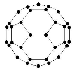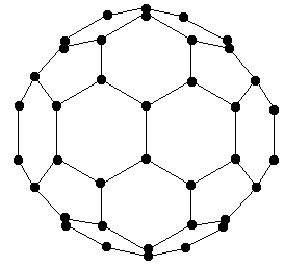 Рис. 6. Молекулы С60 и С70. В настоящее время фуллерены получают, пропуская электрический ток в вакууме через стержни из особо чистого графита. В месте контакта стержней возникает электрическая дуга, и графит начинает испаряться; на стенках камеры осаждается сажа. Затем камеру заполняют газообразным гелием, уносящим от отдельных фрагментов графита избыточную энергию. Из полученной смеси толуолом экстрагируют молекулы фуллеренов. Образующийся темно-красный раствор содержит молекулы С60 и С70 в пропорции 85:15. Дальнейшей хроматографической очисткой получают раствор чистого С60 (красный) или С70 (оранжевый). Упариванием такого раствора можно получить фуллерит — кристаллическое вещество с гранецентрированной кубической решёткой, образованной отдельными молекулами фуллеренов. При охлаждении до -24 °С решётка переходит в простую кубическую с увеличением объёма на 1 %. Интересно, что отдельные молекулы в кристалле фуллерита вращаются вокруг положения равновесия с частотой 1012 Гц. Плотность гексагонального фуллерита 1,7 г/см3, что в 1,35 раза меньше плотности графита. Известна также форма фуллерита, в которой молекулы расположены в вершинах тетраэдров, подобно атомам в кристалле алмаза. Описанный выше способ получения фуллерита является чрезвычайно дорогостоящим, поэтому перспективной является непосредственная добыча фуллеренов из земных недр. Недавно было обнаружено, что минерал шунгит, огромные запасы которого находятся в Карелии, содержит до 0,1 % фуллеренов. К сожалению, еще не разработан промышленный метод выделения последних из шунгита. Чистый фуллерит является полупроводником с шириной запрещенной зоны 1,5 эВ. Как он сам, так и его смеси с другими веществами (например, органическими полимерами) обладают фотопроводимостью: при облучении их даже видимым светом электрическое сопротивление резко падает. Фуллерит с добавками щелочных металлов при низких температурах (до 42,5 К для сплава RbTlC60) становится сверхпроводником. Фуллерит не отличается химической активностью. В инертной атмосфере он стабилен до температуры 1200 К, в присутствии кислорода заметно окисляется уже при 500 К или (в обычных условиях) при облучении видимым светом. При этом образуются СО и СО2, а также аморфная структура с соотношением атомов С и О 5:1. Фуллерит хорошо растворим во многих неполярных растворителях (бензол, сероуглерод, толуол и т. п.). Наиболее интересными из соединений фуллеренов являются продукты внедрения атомов различных элементов внутрь самой молекулы C60 — так называемые эндоэдральные соединения. В настоящее время более трети элементов периодической таблицы могут быть помещены внутрь молекулы фуллерена. В частности, имеются сообщения о получении подобных соединений для натрия, калия, рубидия, цезия, лантана, никеля. Предполагают, что молекулы фуллеренов с внедренными атомами редкоземельных элементов (тербий, гадолиний, диспрозий) будут становиться магнитными диполями, что позволяет, используя тонкие пленки таких соединений, создавать запоминающие устройства с громадной (4·1012 бит/см2) емкостью памяти. Был получен полимер C60, в котором молекулы фуллеренов связаны бензольными кольцами; синтезированы также металлорганические полимеры (C60Pd)n и (C60Pd2)n. Подобные структуры получили название "нить жемчуга". Фуллерит пока не находит широкого практическог