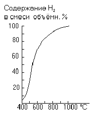 Рис. 8. Равновесие синтеза метана. Метан является простейшим представителем многочисленных соединений углерода с водородом, называемых углеводородами и изучаемых в органической химии. Сам он представляет собой бесцветный и не имеющий запаха газ, малорастворимый в воде. С химической стороны метан характеризуется своей большой инертностью, на него не действуют ни щёлочи, ни кислоты. С кислородом он в обычных условиях не реагирует, но при поджигании сгорает по реакции: СН4 + 2 О2 = СО2 + 2 Н2О. Горение метана сопровождается очень большим выделением тепла (803 кДж/моль). Метан является основой атмосфер тяжёлых планет (Юпитера, Сатурна). Следы его (1,4·10-4 объёмн. %) всегда содержатся в земной атмосфере. Интересно, что повышение содержания метана привлекает комаров. Большие количества метана (часто свыше 90%) содержат многие скопившиеся в подземных пустотах природные газы. Такие газы являются очень хорошим топливом, 1 м3 которого даёт при сгорании 33-38 тыс. кДж. Вместе с тем они служат основным сырьём для промышленного получения водорода. Обычно применяемый при этом метод основывается на неполном окислении метана по уравнению: 2 СН4 + О2 = 2 СО + 4 Н2 + 71 кДж. Получаемый газ подвергается затем вторичной обработке водяным паром. На территории СНГ известны многочисленные месторождения богатых метаном природных газов (Саратов, Ставрополь, Бухара и др.). Благодаря высокой калорийности и удобству транспортировки (по трубопроводам), такой газ с каждым годом занимает всё более важное место в общем топливном балансе страны. Горение смеси метана (и других горючих газов) с воздухом идёт только в том случае, если процентный состав смеси не выходит из некоторых определённых границ. Так, пределы воспламеняемости (в процентах горючего газа по объёму) составляют 5-15 для метана, 12-74 для СО и 4-75 для Н2. Данные эти относятся к обычному давлению и являются ориентировочными, так как помимо давления пределы воспламеняемости зависят и от других условий. При местном нагревании смеси, имеющей подходящий для воспламенения состав, горение почти мгновенно распространяется по всему её объёму и происходит взрыв. В качестве горючего материала подобных взрывчатых смесей с воздухом способны фигурировать не только газы или пары, но и пыль различных горючих веществ (угля, муки, сахара и т. п.). Этим могут быть обусловлены происходящие иногда взрывы на элеваторах, сахарных заводах и т. п. Чтобы поджечь газовую смесь, необходимо хотя бы в одном месте нагреть её до некоторой минимальной температуры, которая носит название температуры воспламенения. Последняя зависит не только от природы реагирующих газов, процентного состава смеси и давления, но и от способа зажигания и некоторых других условий. Поэтому она не является постоянной величиной, а колеблется в некоторых пределах. Так, смесь метана с воздухом воспламеняется под обычным давлением при 650-750, СО — при 610-660, водорода — при 510-590 °С. Само существование определённых температур воспламенения тесно связано с энергиями активации соответствующих реакций. При этом, способные к химическому взаимодействию составные части газовой смеси реагируют друг с другом и при более низких температурах, чем то отвечает появлению пламени, т.е. быстро протекающей реакции, сопровождающейся выделением тепла и света. Однако взаимодействие при подобных у