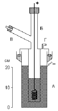 Рис. . Электролизёр для получения фтора. Электролизу подвергают легкоплавкую смесь состава КF·3НF, помещенную в служащую катодом внешний медный сосуд А. Анод из толстой никелевой проволоки помещается в медном цилиндре Б, нижняя боковая часть которого имеет отверстия. Выделяющийся фтор отводится по трубке В (а водород — через отвод Г). Все места соединения отдельных частей прибора делают на пробках из СаF2 и замазке из РbО и глицерина. Свободный фтор состоит из двухатомных молекул и представляет собой почти бесцветный (в толстых слоях зеленовато -желтый) газ с резким запахом. Он сгущается в светло-желтую жидкость при -188 °С и затвердевает при -220 °С. Критическая температура фтора равна -129 °С, критическое давление 55 атм. При температуре кипения жидкий фтор имеет плотность 1,5 г/см3, а теплота его испарения составляет 1,6 кДж/моль. Жидкий фтор, как и его смесь с жидким кислородом (“флокс”), может служить энергичным окислителем реактивных топлив. С SiО2 или стеклом фтор не реагирует. При охлаждении ниже -252 °С его желтоватые кристаллы обесцвечиваются. С химической стороны фтор может быть охарактеризован как одновалентный неметалл, и притом самый активный из всех неметаллов. Обусловлено это рядом причин, в том числе легкостью распада молекулы F2 на отдельные атомы — необходимая для этого энергия составляет лишь 159 кДж/моль (против 493 кДж/моль для О2 и 242 кДж/моль для С12). Атомы фтора обладают значительным сродством к электрону и сравнительно малыми размерами. Поэтому их валентные связи с атомами других элементов оказываются прочнее аналогичных связей прочих металлоидов (например, энергия связи Н-F составляет — 564 кДж/моль против 460 кДж/моль для связи Н-О и 431 кДж/моль для связи Н-С1). Связь F-F характеризуется ядерным расстоянием 1,42 А. Для термической диссоциации фтора расчетным путем были получены следующие данные: