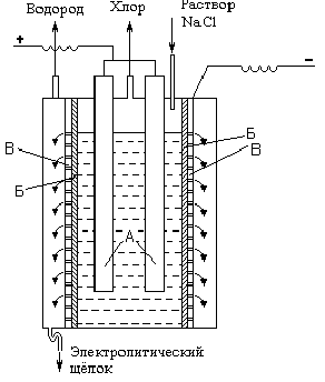 Рис. . Принципиальная схема электролизёра для получения хлора. Основным промышленным методом получения хлора является электролиз концентрированного раствора NаС1. Принципиальная схема электролизера показана на рис. VII-5 (А - аноды, Б - диафрагма, В - катод). При электролизе на аноде выделяется хлор (2С1- - 2е- = С12), а в при катодном пространстве выделяется водород (2Н+ + 2е- = Н2) образуется NаОН. При практическом осуществлении электролиза раствора NaCl расход электроэнергии на получение 1 т хлора составляет около 2700 кВт·ч. Полученный хлор под давлением сгущается в желтую жидкость уже при обычных температурах. Хранят и перевозят его в стальных баллонах, где он заключен под давлением около 6 атм. Баллоны эти должны иметь окраску защитного цвета с зеленой поперечной полосой в верхней части. Для лабораторного получения хлора обычно пользуются действием MnO2 или КМnO4 на соляную кислоту: МnО2 + 4 НСl = МnСl2 + Сl2 + 2 Н2О 2 КМnO4 + 16 НCl = 2 КCl + 2 МnСl2 + 5 Сl2 + 8 Н2О Вторая реакция протекает значительно энергичнее первой (требующей подогревания). Свободный хлор представляет собой желто-зеленый газ, состоящий из двухатомных молекул. Под обычным давлением он сжижается при -34 °С и затвердевает при -101 °С. Один объем воды растворяет около двух объемов хлора. Образующийся желтоватый раствор часто называют «хлорной водой». Критическая температура хлора равна 144 °С, критическое давление 76 атм. При температуре кипения жидкий хлор имеет плотность 1,6 г/см3, а теплота его испарения составляет 20,5 кДж/моль. Твердый хлор имеет плотность 2,0 г/см3 и теплоту плавления 6,3 кДж/моль. Кристаллы его образованы отдельными молекулами С12 (кратчайшее расстояние между которыми равно 334 пм). Связь Сl-Сl характеризуется ядерным расстоянием 198 пм. Термическая диссоциация молекулярного хлора по уравнению С12 + 242 кДж Ы 2 С1 становится заметной примерно с 1000 °С. Атом хлора имеет в основном состоянии структуру внешнего электронного слоя 3s23р5 и одновалентен. Возбуждение его до ближайшего трехковалентного уровня 3s23р44s1 требует затраты 857 кДж/моль. Энергия присоединения электрона к нейтральному атому хлора оценивается в 355 кДж/моль. Сродство к электрону хлора (аналогично и других галоидов) может быть вычислено при помощи рассмотрения реакций образования хлористых солей по отдельным стадиям. Например, для NаС1 имеем: 1) Nа (т) = Nа (г) — 109 кДж (теплота возгонки) 2) 1/2 С12 (г) = С1 (г) — 121 кДж (теплота диссоциации) 3) Na (г) = Nа+(г) + е- — 493 кДж (энергия ионизации) 4) С1(г) + е- = Сl-(г) + Х кДж (искомое сродство к электрону) 5) Nа+(г) + Сl-(г) = NаС1(т) +777 кДж (энергия кристаллической решетки) в сумме: Nа(т) + 1/2 С12(г) = NаСl(т) + (Х+777-493-121-109) кДж С другой стороны, непосредственно определенная на опыте теплота образования NаС1 из элементов равна: Nа(т) + 1/2 С12(г) = NаС1(т) + 410 кДж. Следовательно, по закону Гесса, Х + 777 - 493 - 121 - 109 = 410, откуда Х = 356 кДж. Ион С1- — характеризуется эффективным радиусом 181 пм и энергией гидратации 351 кДж/моль. Для ковалентного радиуса хлора принимается половина ядерного расстояния молекулы С12, т. е. 99 пм. Растворимость хлора в воде меняется с температурой следующим образом: