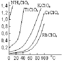 Рис. . Растворимость некоторых перхлоратов (моль/л H2O). Соли НСlO4, за немногими исключениями (рис. ) легко растворимы в воде. Многие из них хорошо растворяются также в органических растворителях (спирте и т. п.). Подобно самой кислоте, большинство перхлоратов бесцветно.Калийперхлорат применяется для приготовления некоторых взрывчатых веществ. При 610 °С он плавится и одновременно начинает разлагаться, в основном по уравнению: KСlO4 = КСl + 2 O2 Получают КСlO4 обычно электролизом раствора КСlO3. Реакция идет по схеме: КСlO3 + Н2О = Н2 (катод) + КСlO4 (анод). При перегонке разбавленных растворов НСlO4 сначала отгоняется вода, затем разбавленная кислота и, наконец, при 203 °С начинает перегоняться азеотропная смесь, содержащая 72 % HСlO4 (близкая к составу НСlO4·2Н2О и замерзающая лишь при -18 °C). Так как кипение последней сопровождается частичным разложением, перегонку HClO4 лучше проводить под уменьшенным давлением (при 20 мм рт. ст. азеотропная смесь перегоняется около 111 °С). Концентрированная (72%) кислота дымит на воздухе и весьма гигроскопична, но устойчива при хранении и не разлагается под действием света. Промышленностью обычно выпускается 30-70 %-ная НСlO4. Молекула HСlO4 имеет форму пирамиды с тремя атомами кислорода в основании [d(СlO) = 141 пм], гидроксильной группой в вершине [d(С10) = 164 пм] и углом О-Сl=O, равным 106°. Безводная хлорная кислота (т. пл. — 101, т. кип. +16'С при 18 мм рт. ст.) представляет собой весьма подвижную жидкость, тогда как ее крепкие водные растворы имеют маслянистую консистенцию. Их охлаждением может быть получен плавящийся лишь при +50 °С кристаллогидрат НСlO4·Н2О, который следует рассматривать как перхлорат оксония — [Н3О]СlO4. Частичное образование последнего по схеме