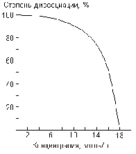 Рис. . Электролитическая диссоциация HClO4. 3 НСlO4 Ы [Н3О]СlO4 + Сl2O7 + 12,5 кДж(с константой равновесия К = 1·10-4) имеет место и в безводной хлорной кислоте. Именно этой реакцией (в силу последующего распада Сl2O7 по схеме 2 Сl2O7 = 4 СlO2 + 3 O2 + 117 кДж) обусловлена, вероятно, неустойчивость безводной хлорной кислоты. Очень сильные взрывы может вызвать ее соприкосновение со способными окисляться веществами. Хлорная кислота находит применение при анализах, в частности для выделения более летучих кислот из их солей. В разбавленных водных растворах НСlO4 не восстанавливается такими сильными восстановителями, как НI, Н2S, SO2 и водород в момент выделения. Даже концентрированная кислота становится очень активным окислителем лишь при температуре кипения (когда она легко растворяет, в частности, специальные стали). Хотя НСlO4 является одной из самых сильных из кислот, наличие недиссоциированных молекул в ее растворах установлено несколькими методами. Как видно из рис. , заметным оно становится лишь в достаточно концентрированных растворах. Для константы равновесия НСlO4 Ы Н+ + СlO4– получено значение К = 38. По другим данным, хлорная кислота ионизирована в растворах еще значительнее, чем то показано на рис. . Входящий в состав перхлоратов анион СlO4- представляет собой тетраэдр с хлором в центре [d(СlO) = 144 пм]. Из безводных перхлоратов без разложения плавится только LiСlO4 (т. пл. 236 °С) . Вообще говоря, их термическое разложение может идти по двум схемам: с образованием хлорида металла и кислорода или оксида металла, хлора и кислорода. Для солей Сs, Rb, К характерен первый путь, для солей Nа, Li, Ва, Sr, Сa преимущественно он же, а для солей Мg и большинства других металлов основным становится второй путь распада. Растворимость некоторых перхлоратов (г на 100 г растворителя при 25 °С) в воде, спирте и ацетоне сопоставлена ниже: