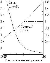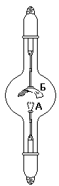 Рис. 1. Относительные характеристики ламп накаливания. Лампы накаливания являются в настоящее время основным средством искусственного освещения. Для повышения коэффициента их полезного действия температура нити накала должна быть возможно более высокой (так как световая отдача раскалённого тела пропорциональна четвертой степени его абсолютной температуры). В современных электролампах нити накала работают при температурах около 2600 °С, что возможно лишь благодаря исключительной тугоплавкости и нелетучести вольфрама. Как видно из рис. 1, отклонения в ту или иную сторону от нормального для данной лампы напряжения (принятого за единицу) существенно сказываются и на её световой отдаче, и на сроке службы. Мировое производство электроламп исчисляется миллиардами штук ежегодно.При длительной работе обычной электролампы вольфрам с её нити постепенно испаряется и оседает тёмным слоем на стекле, а становящаяся все более тонкой нить накала наконец перегорает. Этот процесс “старения” можно сильно задержать введением в лампу следов иода: образующийся при сравнительно невысоких температурах летучий WI2 затем разлагается на накалённой нити, тем самым возвращая ей испарившийся металл. Подобные “иодные лампы” могут при очень малых размерах быть гораздо ярче обычных (за счёт повышения температуры накала), причем их близкий по спектральному составу к дневному световой поток постоянен в течение всего срока службы. Они работают в стационарном режиме уже через 1/2 сек после включения и передают тепло в окружающее пространство более чем на 80 % лучеиспусканием. Мощные установки такого типа с успехом используются для нагревательных целей, вообще же впервые реализованные в 1959 г. иодные лампы уже находят самые разнообразные области применения. Обычно их делают из кварцевого стекла и заполняют (под давлением в несколько атмосфер) ксеноном с примесью паров иода. Важно, чтобы все внутренние металлические детали были только вольфрамовыми. Работа широко применяемого в практике кенотронного выпрямителя основана на способности сильно нагретых металлов испускать электроны. Простейший кенотрон (рис. 2) представляет собой вакуумированный стеклянный баллон, содержащий два электрода: один — в виде вольфрамовой спирали (А), другой — в виде пластинки (Б). Если такой прибор с накаленной (от отдельного источника тока) спиралью включить в цепь переменного тока, то при минусе на спирали электроны переходят на второй электрод, и во внешней цепи идет ток. Напротив, при плюсе на спирали внешняя цепь остается разомкнутой. Таким образом, направление тока все время сохраняется неизменным, т. е. переменный ток превращается в постоянный (точнее, пульсирующий постоянный). Основное преимущество кенотронов перед другими видами выпрямителей заключается в возможности выпрямлять при их помощи тока весьма высокого напряжения. Работа выхода электрона составляет для вольфрама 4,5 эВ, а для молибдена 4,3 эВ.