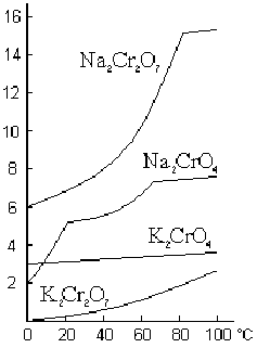Рис. 3. Растворимость хроматов и бихроматов. Растворимость МоО3 и WO3 в воде составляет соответственно около 0,4 и 0,02 г/л. Константы первой ступени кислотной и основной диссоциации Н2МоО4 имеют порядок соответственно 10-2 и 10-13. Вольфрамовая кислота известна в двух формах — белой и желтой. Первая осаждается при взаимодействии растворов вольфрамовокислых солей с разбавленными сильными кислотами на холоду, вторая — с более крепкими сильными кислотами при нагревании. Менее устойчивая белая форма постепенно переходит в желтую. Первая из них представляет собой, по-видимому, коллоидный осадок переменного состава (WO3·хН2О), вторая — определенное химическое соединение (H2WO4·Н2О). Ионы МоO42- и WO42- имеют структуру тетраэдров с атомом металла в центре [d(МоО) = 177, d(WO) = 179 пм].По ряду Сr-Mo-W сила кислот Н2ЭО4 уменьшается. Большинство их солей малорастворимо в воде. Из производных чаще встречающихся металлов хорошо растворимы: хроматы — лишь Nа+, К+, Mg2+ и Са2+, молибдаты и вольфраматы — только Nа+ и К+. Хромовокислые соли окрашены, как правило, в светло-желтый цвет иона СrO42-, молибденово- и вольфрамовокислые бесцветны. Кроме кислот типа Н2ЭO4 для хрома и его аналогов существуют также отвечающие общей формуле Н2Э2О7 и по строению аналогичные пиросерной кислоте. Наибольшее значение из них имеет двухромовая кислота — Н2Сr2О7. Сама она известна только в растворе, но ее соли (двухромовокислые, или бихроматы), К2Сr2О7 (“хромпик”) и Nа2Сr2О7·2Н2О — особенно, являются наиболее обычными хромовыми препаратами и исходными продуктами для получения остальных соединений этого элемента. Прокаливание безводного Nа2Сr2О7 (т. пл. 320 °С) выше 400 °C сопровождается его термическим разложением по уравнению: 4 Nа2Сr2О7 = 4 Nа2СrO4 + 2 Сr2О3 + 3 O2 Хромпик (т. пл. 398 °С) разлагается аналогично, но лишь при более высоких температурах. Хроматы натрия и калия плавятся соответственно при 790 и 963 °С, т. е. значительно выше бихроматов. Ион СrО42- имеет структуру тетраэдра с d(СrО) = 165, а ион Сг2О72- — структуру О3Сr-O-СrО3 с РСrОСr = 115° и d(ОСr) = 191 пм. Для константы равновесия К = [Сг2О72-]/[НСгО4-] при 20 °C в зависимости от ионной силы раствора даются значения 100 (m = 1,0) или 80 (m= 0,5). Хромовая кислота (К1 = 2·10-2 и К2 = 3·10-7) значительно слабее двухромовой (К2 = 2·10-2). Последняя является простейшим представителем так называемых изополикислот общей формулы mН2О·nЭО3 (где n>m), известных в виде их солей. Помимо оранжево-красных бихроматов (m = 1, n = 2), получены темно-красные трихроматы (m = 1, n = 3) и коричнево-красные тетрахроматы (m = 1, n = 4). Из них К2Сr3O10 и К2Сr4O13 плавятся с разложением (переходя в К2Сr2О7) соответственно при 243 и 210 °С. Образование подобных и более сложных изополисолей особенно характерно для молибдена и вольфрама. По мере усложнения состава изополикислот сила их обычно возрастает.
