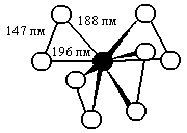 Рис. 5. Схема координации в C8K. С химический точки зрения С8К характеризуется исключительной реакционной способностью. Он самовоспламеняется на воздухе и бурно — вплоть до взрыва — взаимодействует с водой, реагируя при этом как свободный щелочной металл (без образования каких-либо углеводородов). Металлическая ртуть извлекает калий с восстановлением структуры графита, а при действии на С8К жидкого аммиака происходит частичное замещение атомов калия молекулами NH3 по схеме: 3С8К + 4 NH3 = 2 C12K(NH3)2 + К. Подобные же синие металло-аммиачные производные графита с расстоянием между “паркетами” около 660 пм могут быть получены прямым взаимодействием графита с раствором калия в жидком аммиаке. Вещества эти очень чувствительны к влаге, но на воздухе не самовоспламеняются. Аддукт предельного состава С8Br образуется при взаимодействии графита с избытком жидкого брома или его паров (в последнем случае теплота образования около 33,5 кДж/моль). Он устойчив лишь при наличии избытка брома, тогда как в его отсутствие постепенно теряет почти весь бром. Электропроводность этого аддукта значительно выше, чем у исходного графита. Расстояние между плоскостями “паркетов” возрастает при его образовании до 705 пм, причем промежуточные бромные слои образованы цепями из молекул Вr2 ( с ядерным расстоянием 213 и 224 пм). По всей вероятности, рассматриваемый аддукт наиболее правильно описывается равновесием С16 + Вr2 Ы С16+ + Вr2- (предполагалась также формула С56+Вr-•3Вr2). Значительно труднее брома внедряется в графит свободный хлор , тогда как иод вообще не внедряется. Вместе с тем IСl ведёт себя по отношению к графиту аналогично брому. Графит выступает частичным донором электронов в “графитовых солях”. Они получаются действием на графит концентрированных кислот в присутствии сильного окислителя (или при анодном окислении). Например, синий бисульфат приблизительной формулы С24НSО4·Н2SО4. Известны также синие “соли” графита с анионами NO3-, ClO3-, HF2- и др. Все они характеризуются расстоянием между слоями углеродных атомов около 800 пм . При обработке соответствующей концентрированной кислотой каждая из этих “солей” обратимо превращается в другую. Действием воды или восстановителей (хлорид олова (II)) все они могут быть вновь переведены в графит. К данной группе относятся и многочисленные продукты внедрения, возникающие при нагревании графита с безводными хлоридами ряда металлов (часто синтез лучше идёт в присутствии свободного хлора). Примером такого продукта внедрения может служить синее вещество приблизительного состава С8·АlCI3. В результате внедрения структура “паркетов” не изменяется, а расстояние между ними возрастает примерно до 950 пм. Водой некоторые из рассматриваемых веществ (например, Сn·AlCl3) разлагаются легко, тогда как некоторые другие (например, Cn·FeCl3) по отношению к ней весьма устойчивы. Месторождения графита нередко обладают большой мощностью, оцениваемой миллионами тонн. Обычным исходным материалом для его образования служили останки растительности очень древних эпох. Лишь изредка встречаются месторождения, возникшие за счёт выделения углерода из расплавленных магм. Имеющий “минеральное” происхождение графит при сжигании почти не оставляет золы, тогда как обычно зольность его велика (от 1,5 до 15, а иногда даже до 35%). Ежегодная мировая добыча графита с