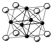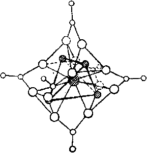 Рис. 6. Схема строения Рис. 7. Схема строения иона Cr2(CH3COO)4·2H2O. [Mo6Cl8]4+. Ион Сr2+ является настолько сильным восстановителем, что способен вытеснять водород из воды по схеме: 2Сr2+ +2 Н+ = 2 Сr3+ + Н2 (скорость этой реакции сильно зависит от каталитического влияния примесей). Кислородом воздуха он легко окисляется. Ввиду этого солянокислый раствор СrСl2 иногда применяют для поглощения кислорода; реакция идет по уравнению 4 СrСl2 + O2 + 4 НСl = 4 СrСl3 + 2 H2O. Чёрный монооксид хрома (СrО) получить в индивидуальном состоянии очень трудно. Он весьма инертен химически, а при нагревании в вакууме выше 700 °С подвергается дисмутации на Сr2О3 и хром. Отвечающий ему гидрат Сr(ОН)2 выделяется в виде очень легко окисляющегося желтого осадка при действии щелочей на раствор СrСl2. Гидрат монооксида хрома имеет основной характер (К1·К2 = 1·10-17) и с кислотами образует соответствующие соли Сr2+. Из них наиболее устойчив малорастворимый ацетат хрома (II) Сr(СН3СОО)2·Н2О, выделяющийся в виде красного осадка при действии СН3СООNа на концентрированный раствор СrСl2. Он имеет димерную структуру, схематически показанную на рис. 6 [d(СrО) = 197, d(СrОН2) = 220, d(СrСr) = 246 пм]. С сернистым аммонием крепкий раствор CrСl2 дает черный осадок моносульфида хрома — СrS. От синего СrSО4·7Н2О производится также синяя двойная соль К2SO4·СrSO4·6Н2О. Сухим путем (прокаливанием металла в атмосфере галогеноводорода) были получены зеленый СrF2 (т. пл. 1100 °С), бесцветный CrВr2 (т. пл. 842 °С) и буро-красный СrI2 (т. пл. 795 °С). В противоположность труднорастворимому фториду, обе последние соли легкорастворимы в воде. Интересен смешанный фторид Сr2F5, содержащий одновременно атомы двух- и трёхвалентного хрома. Из простых по составу производных двухвалентных Mo и W известны главным образом галогенидные соединения. Желтый МоСl2 может быть получен нагреванием молибдена в парах фосгена. Он практически нерастворим в воде, но растворяется в спирте и эфире. По данным рентгеноструктурного анализа, хлориду двухвалентного молибдена отвечает формула Мо6Сl12 со структурой [Мо6Сl8]Сl4. В катионе [Мо8Сl8] атомы хлора расположены по вершинам куба, а атомы молибдена — около середин его граней (рис. 7). Для ядерных расстояний даются значения: d(МоМо) = 260, d(СlСl) = 300 d(MoCl) = 250ё260 пм. При действии на Мо6Сl12 щелочей образуется основание [Мо6Cl8](OH)4, для которого получены соли некоторых кислот. С другой стороны, для Мо6Сl12, известны продукты присоединения типа Мо6Сl12·4КСl. Оранжевый бромид и черный иодид двухвалентного молибдена по свойствам аналогичны хлориду. Спеканием порошка молибдена с серой был синтезирован серый Мо2S3. Серый, неустойчивый на воздухе WСl2 может быть получен нагреванием WСl4 в токе сухого диоксида углерода. Он является сильным восстановителем и при взаимодействии с водой энергично выделяет из нее газообразный водород. Те же свойства характерны и для зеленовато-жёлтого WВr2. Бурый WI2 в холодной воде практически нерастворим, а в горячей разлагается. Галогениды WГ2 могут быть получены также термическим разложением при 500 °С по схеме: 3 WГ4 = WГ2 + 2 WГ5 По-видимому, они подобны аналогичным соединениям молибдена (рис. 7), но производные ионов [W6Г8]4+ значительно менее устойчивы. Особый интерес представляет ацетат двухвалентного молибдена — Mo(СH3СОО)2. Это желтое кристаллическое вещество настолько устойчиво, что около 300 °С возгоняется без разложения. Строение его подобно показанно