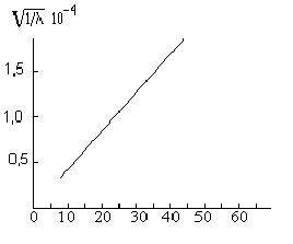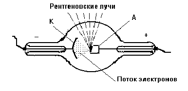 Рис. 1. Рентгеновская трубка. Так как в состав стекла входят различные элементы, получаемое излучение содержит лучи различных длмн волн, что создаёт неудобства при пользовании им. Для избежания этого в рентгеновской трубке (рис. 1) против катода (К) устанавливается анод (А), сделанный из какого-дибо простого вещества. Попадая на его однородную поверхность, поток электронов вызывает образование рентгеновских лучей, характеризующихся некоторой определённой длиной волны. В 1912 г. Мозли поставил перед собой задачу изучить длины волн рентгеновских лучей, получаемых от анодов, сделанных из различных химических элементов. Оказалось, что длины волн изменяются довольно закономерно, как это видно из рис. 2. При обработке результатов измерений обнаружилось, что корень квадратный из обратных значений длин волн является линейной функцией атомного номера, т. е. порядкового номера элемента в периодической системе (рис 3).