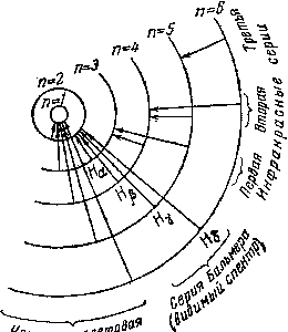 Рис. III-23. Схема происхождения водородного спектра Работа, которую необходимо затратить для вырывания электрона водородного атома с той или иной орбиты, обратно пропорциональна квадрату ее главного квантового числа. Поэтому, например, вырвать электрон с третьей орбиты в девять раз легче, чем с первой. Вычисленные частоты излучений, возникающих при перескоках электрона с одних орбит на другие, оказались совпадающими с частотами линий наблюдаемого на опыте водородного спектра. Как видно из рис. III-23, перескокам с различных более удаленных от ядра орбит на отвечающую n = 1 соответствуют линии серии, лежащей в ультрафиолетовой области, перескокам на орбиту с n = 2— линии серии Бальмера (рис. III-21), а перескокам на орбиты с n = 3, 4 и 5 — линии трех серий, лежащих в инфракрасной области. Две последние серии были обнаружены экспериментально уже после разработки теории водородного атома и именно на основе ее предсказаний. 5-6 Если сообщить водородному атому достаточную энергию, то происходит его ионизация — распад на электрон и протон. Энергия, которую нужно для этого затратить, отвечает n = Ґ (рис. III -24) и называется энергией ионизации (I). Она определена из спектра и для нормального состояния атома водорода составляет 1311 кДж на моль. Н + 1311 кДж = Н+ + е По соотношению I = 1311/n2 энергия ионизации может быть рассчитана и для возбужденных состояний атома водорода. 7 Дальнейшее развитие теории водородного атома было дано Зоммерфельдом (1916 г.), показавшим, что кроме круговых орбит электрон может двигаться и по эллиптическим (с ядром в одном из фокусов эллипса), причем почти одинаковому уровню энергии соответствует столько возможных типов орбит, сколько единиц в главном квантовом числе. Последнее определяет размер большой полуоси данного семейства эллипсов (в частном случае круга его радиус). Величина малой полуоси определяется «п о б о ч н ы м» квантовым числом (6), которое также принимает значения последовательных целых чисел, но не может быть больше главного. Для большой полуоси эллипса действительно соотношение а = n2r, а для малой b = nkr, где r — радиус орбиты при нормальном состоянии атома (53 пм). Например, для главного квантового числа 3 возможны три типа эллипсов, характеризующиеся обозначениями 31, 32 и 33, которые показывают, что большая полуось относится к малой соответственно как 3 : 1, 3 : 2 и 3 : 3. В последнем случае имеем частный вид эллипса — круг, который один только и рассматривался первоначальной теорией. Модель возможных электронных орбит атома водорода по Зом- мерфельду показана на рис. III-25. Отвечающие каждой из них энергетические уровни (п о д у р о в н и) схематически сопоставлены на рис. III-26 (Б) с уровнями, соответствующими только круговым орбитам (Ф). Произведенное Зоммерфельдом уточнение модели водородного атома позволило объяснить тонкую структуру спектральных линий. На рис. 111-26 видно, что наинизшие подуровни отвечают наиболее **"У™ *** "Р*"™ Ри**Ш-25. Именно они и будут поэтому в первую тронных орбит атома водорода по