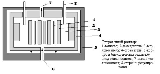 Это и есть микроскопическое сечение, представляющее собой эффективную площадь поперечного сечения атомного ядра, попав в которое налетающая частица вызывает ядерную реакцию или испытывает рассеяние. В процессе экспериментальных исследований энергетической зависимости сечения взаимодействия частиц и различных атомных ядер было обнаружено, что при определенных энергиях значения сечений резко возрастают, а при дальнейшем увеличении энергии снова уменьшаются. Это явление называется резонансом. В практике реакторостроения нейтроны по энергии принято делить на следующие группы: быстрые нейтроны с энергией 0,10 - 10 МэВ, тепловые нейтроны, находящиеся в тепловом равновесии с ядрами среды и имеющие энергию 0,005 - 0,2 эВ, и промежуточные (2 - 102 эВ) и надтепловые (0,2 - 2 эВ). При взаимодействии нейтрона и ядер могут протекать следующие реакции: упругое рассеяние, неупругое рассеяние, радиационный захват, деление. Вероятность протекания определенной реакции характеризуется микроскопическими сечениями. В зависимости от энергии нейтрона сечения могут изменятся. Так, в области быстрых нейтронов сечение радиационного захвата примерно в 100 раз меньше сечения захвата тепловых нейтронов. Сечение упругого рассеяния, как правило, почти постоянное для энергии выше 1 эВ. Наряду с микроскопическими сечениями на практике используются также макроскопические сечения, под которыми понимают вероятность взаимодействия частицы в единице объема вещества. Если в единице объема число ядер определенного типа есть N, то макроскопическое сечение = микроскопическое сечение S=sN. Как и микроскопическое, макроскопическое сечение также характеризует определенный тип ядерной реакции. 7 ЦЕПНАЯ ЯДЕРНАЯ РЕАКЦИЯ7.3 Ядерные реакторы.При делении тяжелых ядер образуется несколько свободных нейтронов. Это позволяет организовать так называемую цепную реакцию деления, когда нейтроны, распространяясь в среде, содержащей тяжелые элементы, могут вызвать их деление с испусканием новых свободных нейтронов. Если среда такова, что число вновь рождающихся нейтронов увеличивается, то процесс деления лавинообразно нарастает. В случае, когда число нейтронов при последующих делениях уменьшается, цепная ядерная реакция затухает. Для получения стационарной цепной ядерной реакции, очевидно, необходимо создать такие условия, чтобы каждое ядро, поглотившее нейтрон, при делении выделяло в среднем один нейтрон, идущий на деление второго тяжелого ядра. Ядерным реактором называется устройство, в котором осуществляется и поддерживается управляемая цепная реакция деления некоторых тяжелых ядер. Цепная ядерная реакция в реакторе может осуществляться только при определенном количестве делящихся ядер, которые могут делиться при любой энергии нейтронов. Из делящихся материалов важнейшим является изотоп 235U, доля которого в естественном уране составляет всего 0,714 %. Хотя 238U и делится нейтронами, энергия которых превышает 1,2 МэВ, однако самоподдерживающаяся цепная реакция на быстрых нейтронах в естественном уране не возможна из-за высокой вероятности неупругого взаимодействия ядер 238U с быстрыми нейтронами. При этом энергия нейтронов становится ниже пороговой энергии деления ядер 238U. Использование замедлителя приводит к уменьшению резонансного поглощения в 238U, так как нейтрон м