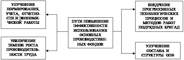 Из данных таблицы 9 следует, что эффективность использования оборотных средств возросла, так как коэффициент оборачиваемости возрос в среднем за 3 года на 35 %, в отчетном году по сравнению с прошлым – на 24 %, срок оборота снизился на 17 %, потребность в оборотных ресурсах, приходяцаяся на 1 рубль выручки так же снизился на 18 %. Поэтому, несмотря на привлечение заемных средств в виде кредитов, предприятие эффективно использует оборотный капитал. Однако в целом, характеризуя использование основного и оборотного капитала следует тенденция уменьшения темпов производительности труда на ООО «ТЭМРО» за счет увеличения износа основных производственных фондов. Существует необходимость проведения мероприятий по решению данных задач. 3. ПУТИ ПОВЫШЕНИЯ ЭФФЕКТИВНОСТИ ИСПОЛЬЗОВАНИЯ ОСНОВНЫХ ПРОИЗВОДСТВЕННЫХ ФОНДОВ И ОБОРОТНЫХ СРЕДСТВ НА ООО «ТЭМРО» Очень важным для предприятия является использование оборотных средств и основных фондов, поддержание их в размере, оптимизирующем управление текущей деятельностью. Анализ эффективности использования средств является важнейшим инструментом деятельности предприятия. Насколько глубоко и детально в предприятии проводится такой анализ, настолько и эффективной, успешной будет финансово-хозяйственная деятельность предприятия. Для эффективного использования основных фондов в производственном процессе необходимо увеличение доли активной части ОПФ, тем самым будут достигнуты: - замедление падения темпов роста: - увеличение темпов производительности труда: - уменьшение износа ОПФ, что в дальнейшем могло бы повлиять на снижение темпов работы деятельности предприятия. Пути повышения эффективности использования приведем на рис.4. ПУТИ ПОВЫШЕНИЯ ЭФФЕКТИВНОСТИ ИСПОЛЬЗОВАНИЯ ОПФ