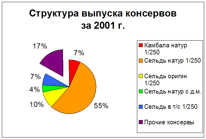 2.2 Факторный анализ себестоимости продукцииДля того чтобы проводить факторный анализ по консервному цеху, необходимо выбрать определенные виды консервов. Рыбокомбинат выпускает около 30 видов консервной продукции. Какие консервы будут более интересны для анализа? Выбор остановился на следующих видах консервной продукции: камбала натуральная, сельдь натуральная, сельдь оригинальная, сельдь натуральная с добавлением масла и сельдь в томатном соусе. Именно эта продукция занимает наибольший вес в общем выпуске за два анализируемого года (см. Приложение 2, табл. 2.1 и табл. 2.2). Удельный вес в годовом объеме выпуска по пяти видам консервной продукции достигает высокого показателя 82,95% в 2001 году и 61,55% в 2002 году. Хоть и наблюдается динамика снижения (на 21,4%), но их доля в общем выпуске остается весомой. Таблица 2.1 – Удельный вес основных видов консервной продукции в общем объеме выпуска продукции ОАО «ВРК»